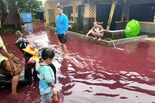 ម៉ាឡេស៊ី៖ ទឹកជំនន់មានពណ៌ក្រហមច្រាលដូចឈាម បានជន់លិចសហគមន៍មួយកន្លែងនៅក្នុងប្រទេសឥណ្ឌូនេស៊ី នៅក្នុងពេលតែមួយយប់ប៉ុណ្ណោះ ដែលហេតុការណ៍នេះបានធ្វើឲ្យពលរដ្ឋនៅក្នុងសហគមន៍មានការភ្ញាក់ផ្អើលយ៉ាងខ្លាំង។ បើយោងតាមការចុះផ្សាយនៅក្នុងសារព័ត៌មាន បាងកកប៉ុស្តិ៍ បានឲ្យដឹងថា ហេតុការណ៍នេះបានកើតឡើងនៅក្នុងភូមិ Kelurahan Jenggot ក្រុង Pekalongan នៃខេត្តចាវ៉ា និងបានកើតឡើងកាលពីថ្ងៃអាទិត្យ ទី០៧ ខែកុម្ភៈ ឆ្នាំ២០២១។