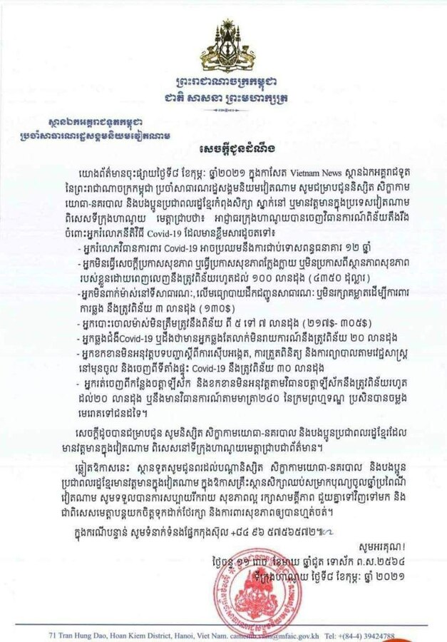 ស្ថានទូតកម្ពុជា៖ យោងតាមការចុះផ្សាយថ្ងៃទី៨ ខែកុម្ភៈ ឆ្នាំ២០២១ ក្នុងការសែត Vietnam News ស្ថានឯកអគ្គរាជទូតនៃព្រះរាជាណចក្រម្ពុជា ប្រចាំសាធារណរដ្ឋសង្គមនិយមវៀតណាម សូមជម្រាបជូននិស្សិត សិក្ខាកាម យោធា-នគរបាល និងបងប្អូនប្រជាពលរដ្ឋខ្មែរកំពុងសិក្សា ស្នាក់នៅ ឬមានវត្តមានក្នុងប្រទេសវៀតណាមពិសេសទីក្រុងហាណូយ មេត្តាជ្រាបថា៖ អាជ្ញាធរក្រុងហាណូយបានចេញវិធានការពិន័យតឹងរ៉ឹងចំពោះអ្នករំលោភនីតិវិធី Covid-19 ដែលមានខ្លឹមសារដូចតទៅនេះ៖
