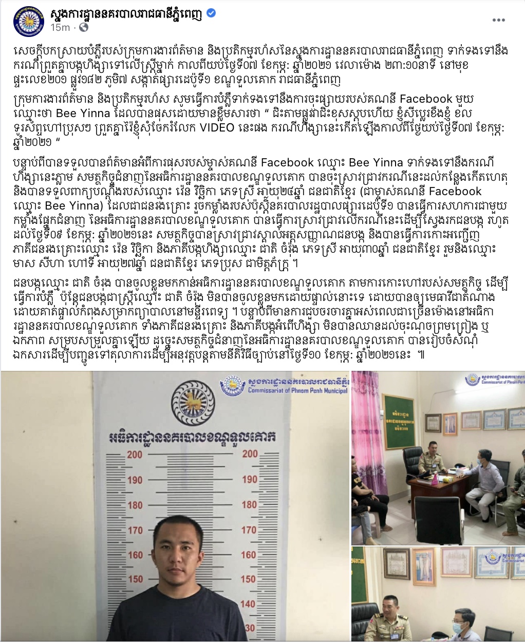 បើតាមការអោយដឹងនៅលើ Facebook ស្នងការដ្ឋាននគរបាលរាជធានីភ្នំពេញបានអោយដឹងថា៖ “សេចក្តីបកស្រាយបំភ្លឺរបស់ក្រុមការងារព័ត៌មាន និងប្រតិកម្មរហ័សនៃស្នងការដ្ឋាននគរបាលរាជធានីភ្នំពេញ ទាក់ទងទៅនឹងករណីព្រួតគ្នាបង្កហិង្សាទៅលេីស្ត្រីម្នាក់ កាលពីយប់ថ្ងៃទី០៧ ខែកុម្ភ: ឆ្នាំ២០២១ វេលាម៉ោង ២៣:១០នាទី នៅមុខផ្ទះលេខ២០១ ផ្លួវ១៨២ ភូមិ៧ សង្កាត់ផ្សារដេប៉ូទី១ ខណ្ឌទួលគោក រាជធានីភ្នំពេញ។ ក្រុមការងារព័ត៌មាន និងប្រតិកម្មរហ័ស សូមធ្វើការបំភ្លឺទាក់ទងទៅនឹងការចុះផ្សាយរបស់គណនី Facebook មួយឈ្មោះថា Bee Yinna ដែលបានផុសដោយមានខ្លឹមសារថា “ ជិះតាមផ្លូវវាជិះខុសស្តុបហើយ ខ្ញុំស៊ីប្លេរខឹងខ្ញុំ ខលទូរស័ព្ទហៅប្រុសៗ ព្រួតគ្នាវ៉ៃខ្ញុំសុំចែករំលែក VIDEO នេះផង ករណីហិង្សានេះកេីតឡេីងកាលពីថ្ងៃយប់ថ្ងៃទី០៧ ខែកុម្ភ: ឆ្នាំ២០២១ “