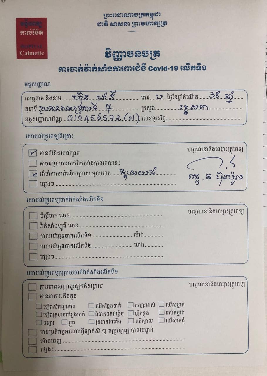 កាលពីព្រឹកថ្ងៃទី១០ ខែកុម្ភៈ ឆ្នាំ២០២១ នេះ គឺជាដំណើរការនៃការចាក់វ៉ាក់សាំងការពារជំងឺកូវីដ១៩ ដែលជាជំនួយរបស់រដ្ឋាភិបាលចិន ជូនមកកាន់ប្រទេសកម្ពុជា ដោយក្នុងនោះអ្នកមានអាយុចន្លោះពី១៨ ទៅ ៥៩ឆ្នាំ ទើបអាចចាក់បាន។ នាព្រឹកមិញនេះផងដែរ កូនប្រុសរបស់សម្តេចតេជោ ហ៊ុន សែន គឺឧត្តមសេនីយ៍ឯក ហ៊ុន ម៉ាណែត និងឯកឧត្តម ហ៊ុន ម៉ានិត បានធ្វើការចាក់វ៉ាក់សាំងការពារជំងឺកូវីដ១៩ រួចរាល់អស់ហើយ ប៉ុន្តែឯកឧត្តម ហ៊ុន ម៉ានី ត្រូវលើកពេលចាក់វ៉ាក់សាំង ដោយសារតែឯកឧត្តមមានជំងឺផ្តាសាយធំ។