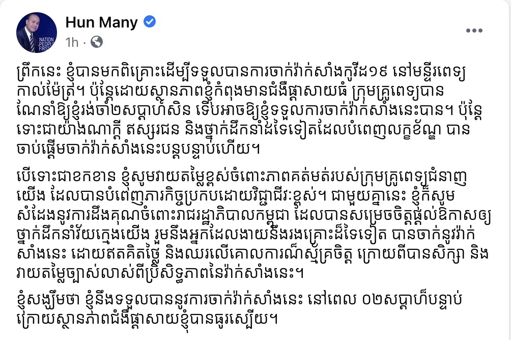 ឯកឧត្តម ហ៊ុន ម៉ានី បានបញ្ជាក់នៅលើគណនីហ្វេសប៊ុករបស់ឯកឧត្តមថា “ព្រឹកនេះ ខ្ញុំបានមកពិគ្រោះដើម្បីទទួលបានការចាក់វ៉ាក់សាំងកូវីដ១៩ នៅមន្ទីរពេទ្យកាល់ម៉ែត្រ។ ប៉ុន្តែដោយស្ថានភាពខ្ញុំកំពុងមានជំងឺផ្តាសាយធំ ក្រុមគ្រូពេទ្យបានណែនាំឱ្យខ្ញុំរង់ចាំ២សប្តាហ៍សិន ទើបអាចឱ្យខ្ញុំទទួលការចាក់វ៉ាក់សាំងនេះបាន។ ប៉ុន្តែទោះជាយ៉ាងណាក្តី ឥស្សរជន និងថ្នាក់ដឹកនាំដទៃទៀតដែលបំពេញលក្ខខ័ណ្ឌ បានចាប់ផ្តើមចាក់វ៉ាក់សាំងនេះបន្តបន្ទាប់ហើយ។ បើទោះជាខកខាន ខ្ញុំសូមវាយតម្លៃខ្ពស់ចំពោះភាពគត់មត់របស់ក្រុមគ្រូពេទ្យជំនាញយើង ដែលបានបំពេញភារកិច្ចប្រកបដោយវិជ្ជាជីវៈខ្ពស់។ ជាមួយគ្នានេះ ខ្ញុំក៏សូមសំដែងនូវការដឹងគុណចំពោះរាជរដ្ឋាភិបាលកម្ពុជា ដែលបានសម្រេចចិត្តផ្តល់ឱកាសឲ្យថ្នាក់ដឹកនាំវ័យក្មេងយើង រួមនឹងអ្នកដែលងាយនឹងរងគ្រោះដ៏ទៃទៀត បានចាក់នូវវ៉ាក់សាំងនេះ ដោយឥតគិតថ្លៃ និងឈរលើគោលការណ៏ស្ម័គ្រចិត្ត ក្រោយពីបានសិក្សា និងវាយតម្លៃច្បាស់លាស់ពីប្រិសិទ្ធភាពនៃវ៉ាក់សាំងនេះ។ ខ្ញុំសង្ឃឹមថា ខ្ញុំនឹងទទួលបាននូវការចាក់វ៉ាក់សាំងនេះ នៅពេល ០២សប្តាហ៏បន្ទាប់ ក្រោយស្ថានភាពជំងឺផ្តាសាយខ្ញុំបានធូរស្បើយ”៕