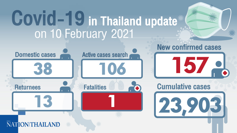 យោងតាមការចុះផ្សាយរបស់សារព័ត៌មាន The Nation Thailand សម្រាប់ថ្ងៃពុធ ទី១០ ខែកុម្ភៈ ឆ្នាំ២០២១ បានរាយការណ៍ថា ប្រទេសថៃបានកត់ត្រាករណីថ្មីនៃជំងឺ COVID-19 ចំនួន ១៥៧ ករណី នៅក្នុងរយៈពេល ២៤ ម៉ោងចុងក្រោយនេះ ដោយក្នុងនោះមាន ៨នាក់ គឺជាករណីនាំចូលពីបរទេស ដែលនាំឱ្យចំនួនឆ្លងសរុបចាប់តាំងពីប្រទេសនេះមានករណីជំងឺ COVID-19 ដំបូងកាលពីឆ្នាំមុន កើនដល់ ២៣,៩០៣ ករណី។ ក៏មានការស្លាប់ថ្មីម្នាក់ត្រូវបានកត់ត្រាផងដែរ ដែលនាំឱ្យការស្លាប់សរុបបានកើនឡើងដល់ ៨០ ករណី។