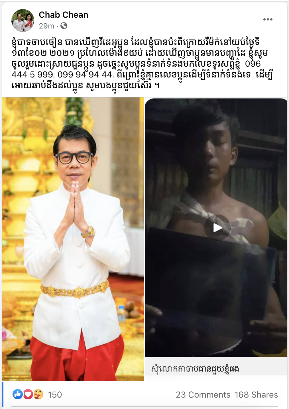 លោកពូ ចាប ចៀន មានគណនីហ្វេសបុក Chab Chean បានបង្ហោះថា៖ “ខ្ញុំបាទចាបចៀន បានឃើញវីដេអូប្អូន ដែលខ្ញុំបានប៉ះពីក្រោយរឺម៉ក់នៅយប់ថ្ងៃទី ១៣ខែ០២ ២០២១ ប្រហែលម៉ោង៩យប់ ដោយឃើញថាប្អូនមានបញ្ហាដៃ ខ្ញុំសូមចូលរួមដោះស្រាយជូនប្អូន ដូចច្នេះសូមប្អូនទំនាក់ទំនងមកលេខទូរសព្ទ័ខ្ញុំ 096 444 5 999. 099 94 94 44. ពីព្រោះខ្ញុំគ្មានលេខប្អូនដើម្បីទំនាក់ទំនងទេ ដើម្បីអោយឆាប់ដឹងដល់ប្អូន សូមបងប្អូនជួយស៊ែរ”៕