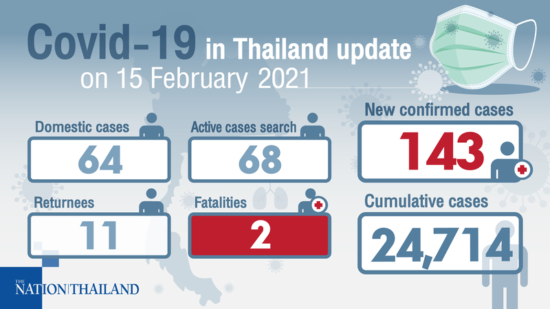 យោងតាមការចុះផ្សាយរបស់សារព័ត៌មាន The Nation Thailand សម្រាប់ថ្ងៃច័ន្ទ ទី១៥ ខែកុម្ភៈ ឆ្នាំ២០២១ បានរាយការណ៍ថា ប្រទេសថៃបានកត់ត្រាករណីជំងឺ COVID-19 ចំនួន ១៤៣ ករណី និងការស្លាប់ថ្មីចំនួន ២ ករណី ដែលនាំឱ្យចំនួនឆ្លងសរុបមានដល់ ២៤,៧១៤ ករណី និងការស្លាប់សរុបចំនួន ៨២ ករណី។ ក្នុងចំណោមករណីថ្មីៗទាំងអស់គឺមានតែ ១១ ករណីប៉ុណ្ណោះ ដែលជាករណីនាំចូលពីបរទេស និងត្រូវបានដាក់ដោយឡែកនៅពេលទៅដល់ប្រទេសថៃភ្លាម។