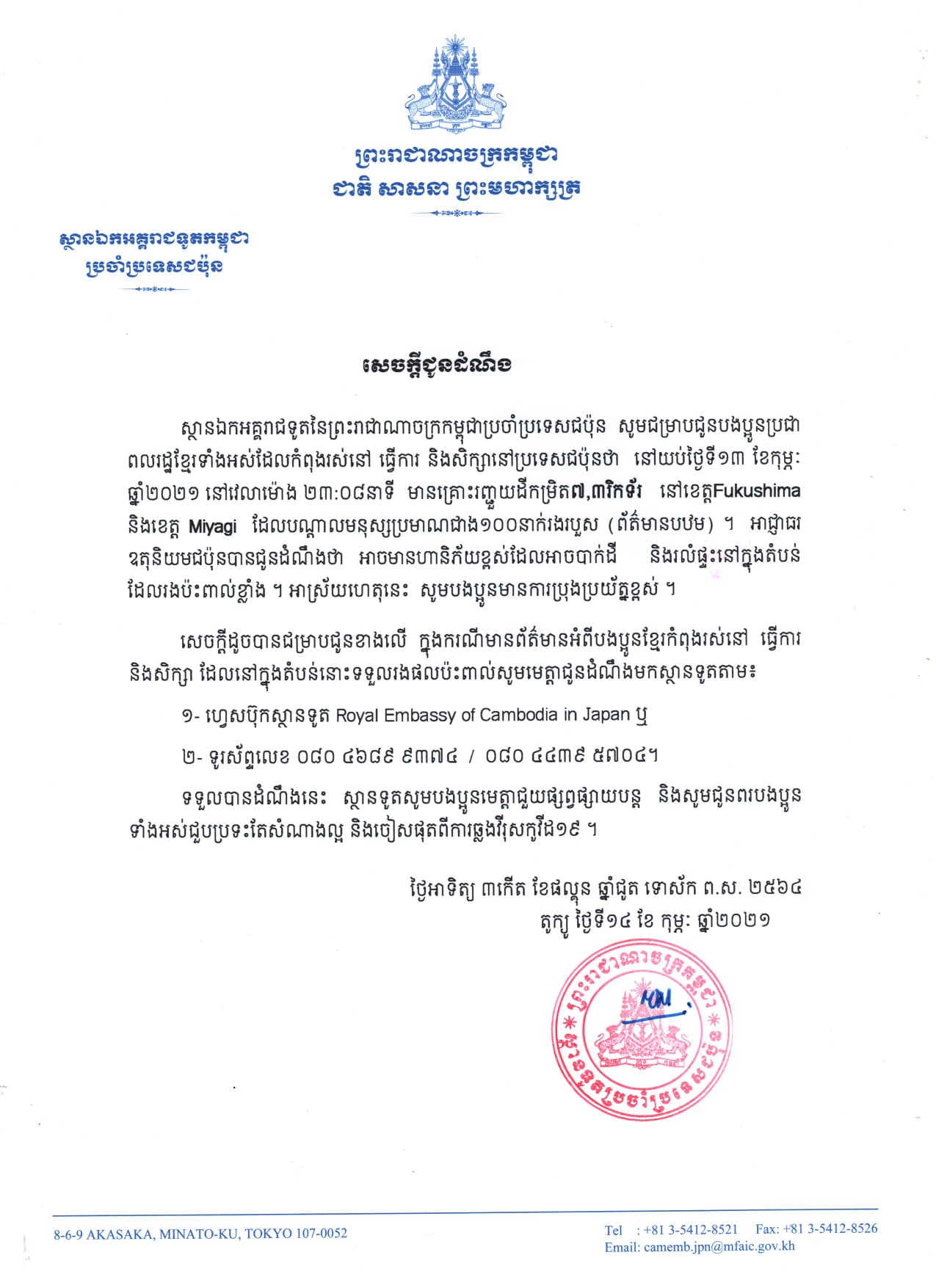 សេចក្តីជូនដំណឹងរបស់ស្ថានទូតកម្ពុជាប្រចាំប្រទេសជប៉ុន ពាក់ព័ន្ធនឹងគ្រោះរញ្ជួយដីកម្រិត ៧,៣រិកទ័រ នៅខេត្ត Fukushima និងខេត្តMyyagi