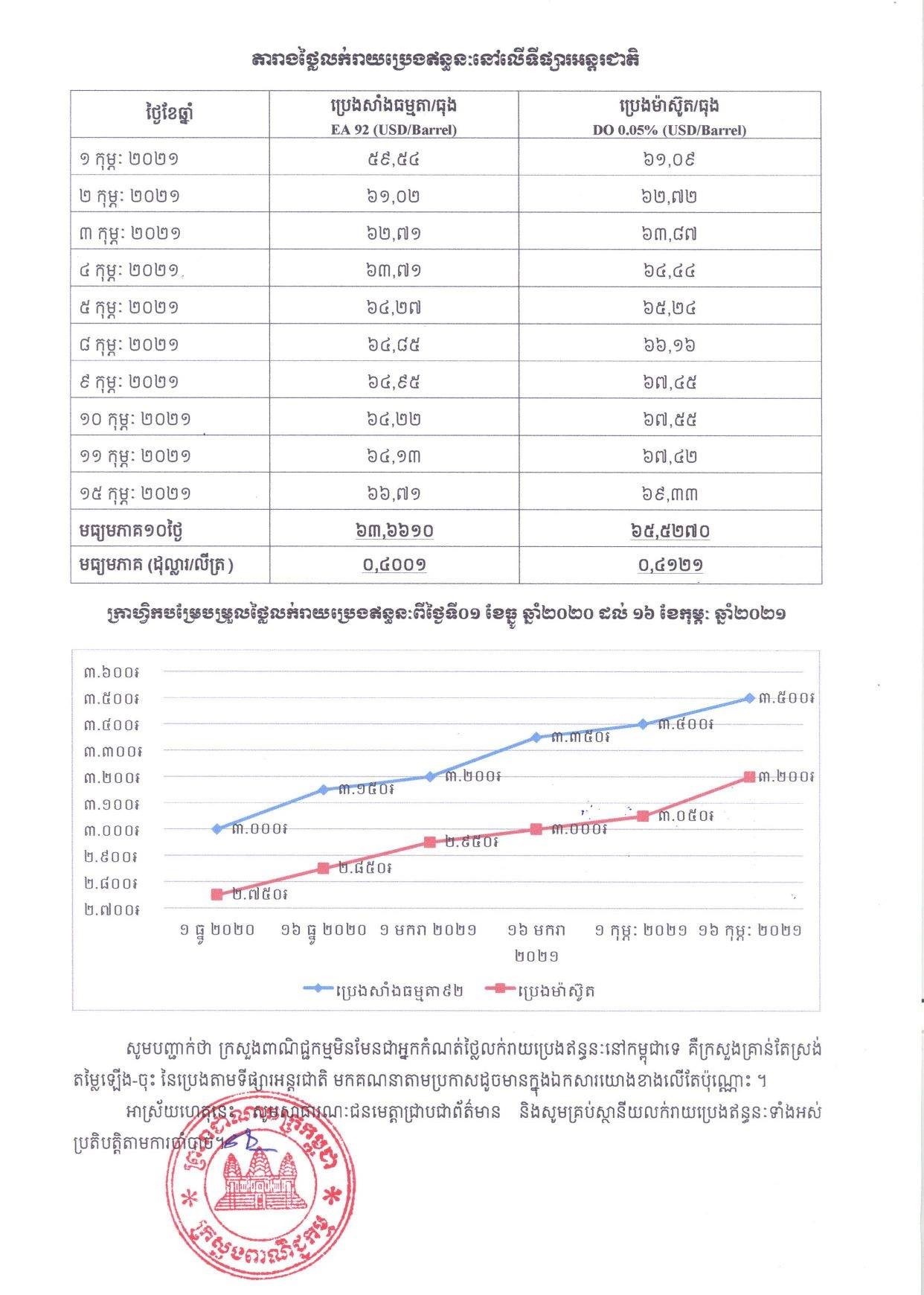 រាជធានីភ្នំពេញ៖ យោងតាមលិខិតរបស់ក្រសួងពាណិជ្ជកម្ម ចុះផ្សាយថ្ងៃទី១៦ ខែកុម្ភៈ ឆ្នាំ២០២១ ស្តីអំពីតម្លៃលក់រាយប្រេងឥន្ធនៈនៅតាមស្ថានីយទាំងអស់ក្នុងព្រះរាជាណាចក្រកម្ពុជាសម្រាប់អនុវត្តទៅតាមតម្លៃមធ្យមប្រេងឥន្ធនៈលើទីផ្សារអន្តរជាតិ ចាប់ពីថ្ងៃទី១៦ ដល់ថ្ងៃទី២៨ ខែកុម្ភៈ ឆ្នាំ២០២១ បានឲ្យដឹងថា តម្លៃប្រេងសាំងធម្មតាមានតម្លៃ ៣,៦៦០រៀលក្នុងមួយលីត្រ ចំណែកឯប្រេងសាំងម៉ាស៊ូតមានតម្លៃ ៣,៣៦០រៀលក្នុងមួយលីត្រប៉ុណ្ណោះ។