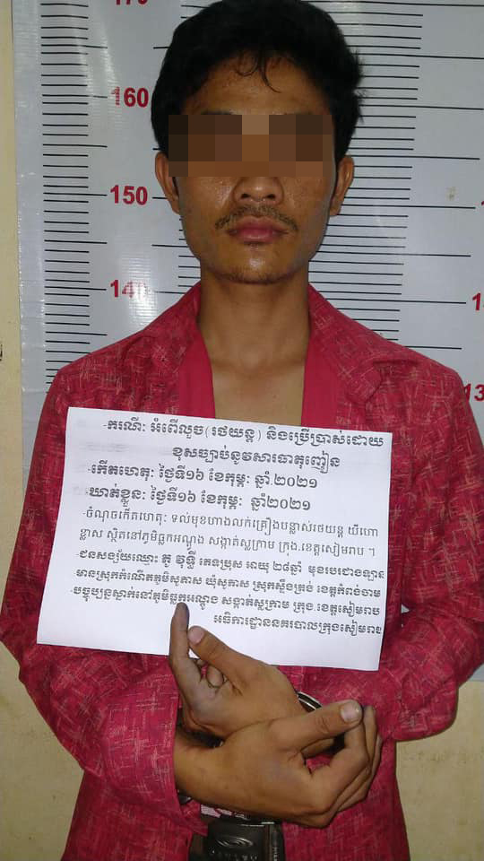ខេត្តសៀមរាប៖ ថ្ងៃទី១៧ ខែកុម្ភៈ ឆ្នាំ២០២១ កម្លាំងអធិការដ្ឋាននគរបាលក្រុងសៀមរាបបានឃាត់ខ្លួនជនសង្ស័យចំនួន ០១នាក់ ឈ្មោះ ភូ វុទ្ធី ភេទប្រុស អាយុ២៨ឆ្នាំ ជាងជួសជុលរថយន្ត មានស្រុកកំណើតនៅភូមិសូភាស ឃុំសូភាស ស្រុកស្ទឹងត្រង់ ខេត្តកំពង់ចាម បច្ចុប្បន្នស្នាក់នៅ ភូមិធ្លកអណ្ដូង សង្កាត់ស្លក្រាម ក្រុង-ខេត្តសៀមរាប ពាក់ព័ន្ធករណីអំពើលួច (រថយន្ត) និងបទប្រើប្រាស់ដោយខុសច្បាប់នូវសារធាតុញៀន។