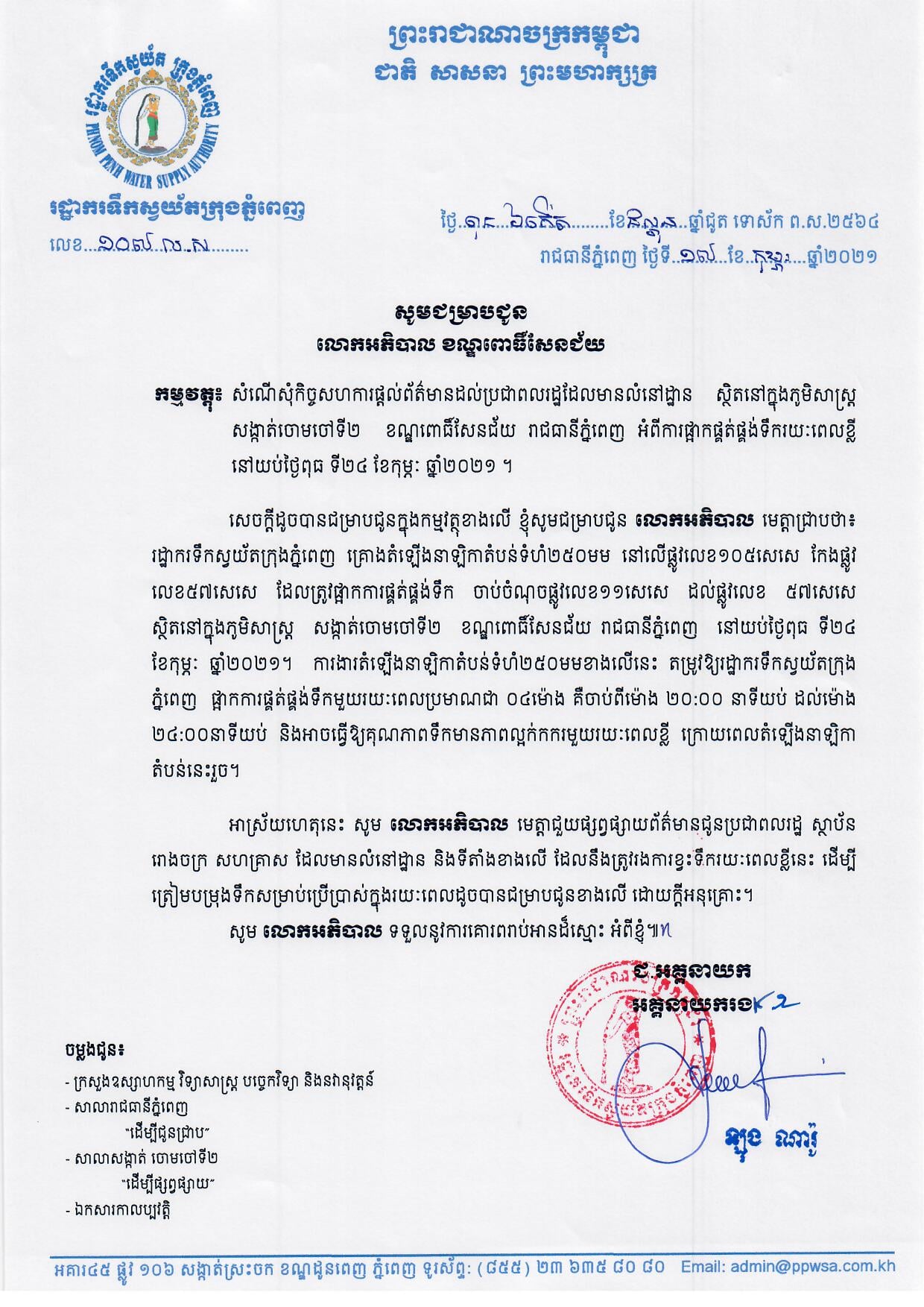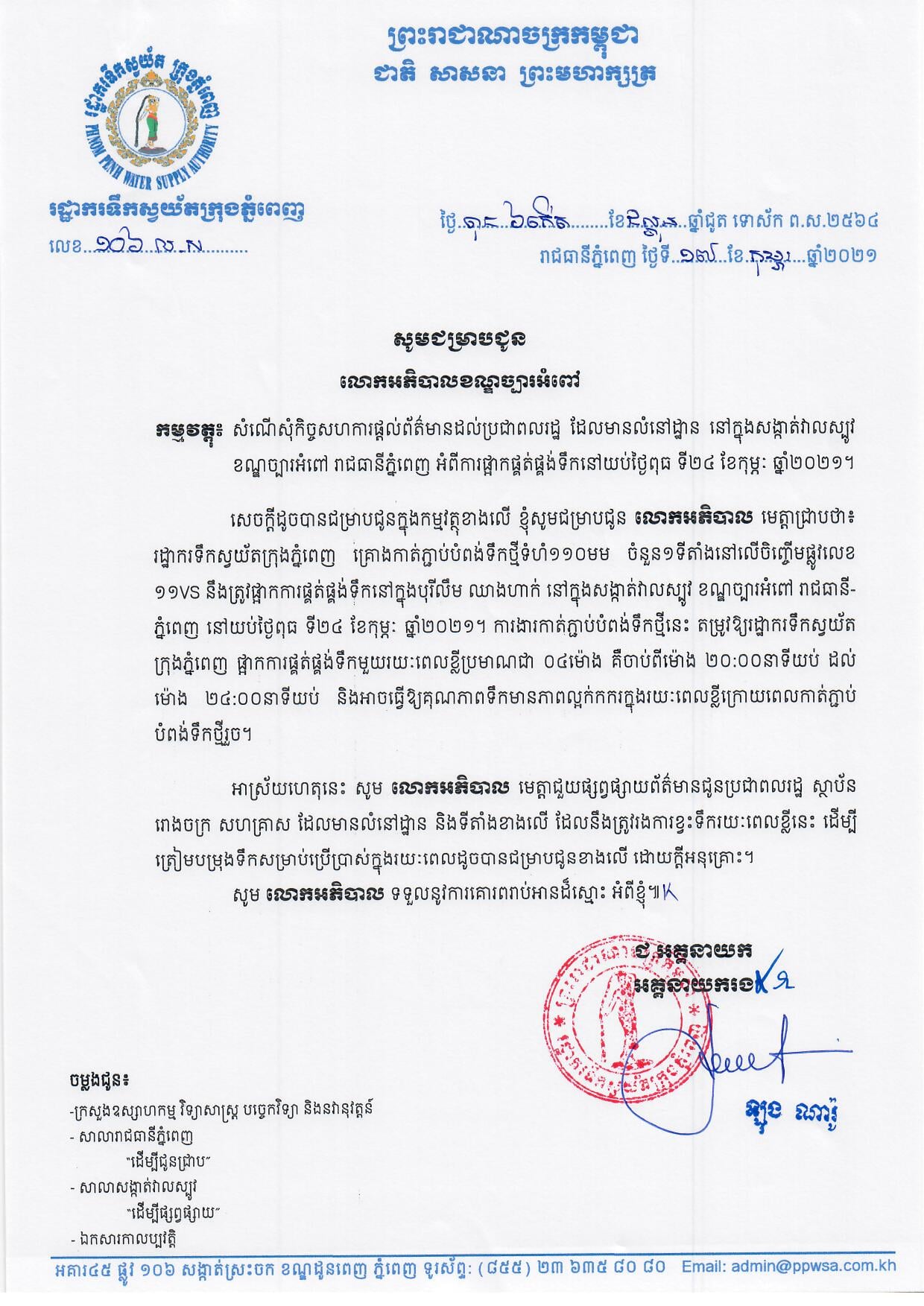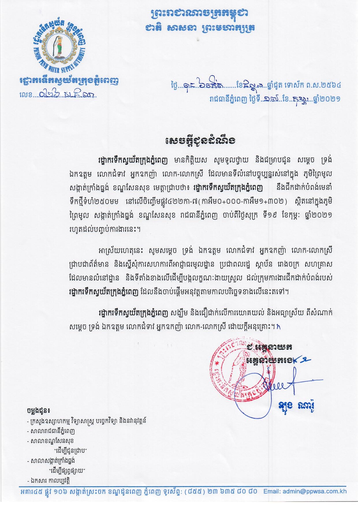 រាជធានីភ្នំពេញ៖ យោងតាមការចុះផ្សាយរបស់ រដ្ឋាករទឹកស្វយ័តក្រុងភ្នំពេញ នៅថ្ងៃទី១៧ ខែកុម្ភៈ ឆ្នាំ២០២១ បានចេញសេចក្តីជូនដំណឹង ស្តីពីការផ្អាកផ្គត់ផ្គង់ទឹកស្អាតមួយរយៈពេលខ្លីនៅ៖