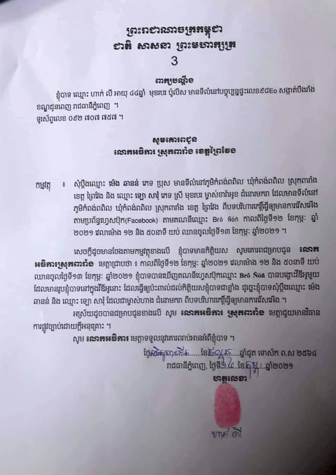 សេចក្តីបកស្រាយបំភ្លឺរបស់អ្នកនាំពាក្យនៃស្នងការដ្ឋាននគរបាលរាជធានីភ្នំពេញ​ លេីករណីលោកវរសេនីយ៍ត្រី ហាក់​ លី​ ដែលបានបង្កអំពេីហិង្សានៅខេត្តព្រៃវែង​ ស្នងការដ្ឋាននគរបាលរាជធានីភ្នំពេញ​ សូមធ្វេីការបកស្រាយបំភ្លឺជូនមហាជនឲ្យបានជ្រាបថា​ កាលពីថ្ងៃទី១២ ខែកុម្ភ: ឆ្នាំ២០២១​ លោក ហាក់​ លី​ ពិត​ជាបានបង្កអំពេីហិង្សាទៅលេីនារីម្នាក់នៅហាងខារ៉ាអូខេនៅខេត្តព្រៃវែង ពេលនេះលោក​ ហាក់​ លី​ ត្រូវបានតម្រួតបទបញ្ជានៃស្នងការដ្ឋាននគរបាលរាជធានីភ្នំពេញ​ធ្វេីការឃាត់ខ្លួន​ ម្យ៉ាងវិញទៀតស្នងការនគរបាលរាជធានីភ្នំពេញ​ និងអនុវត្តបន្តតាមនីតិវិធីច្បាប់ ដោយរង់ចាំការសម្រេចរបស់ព្រះអជ្ញារខេត្តព្រៃវែងជាមុនសិន​។