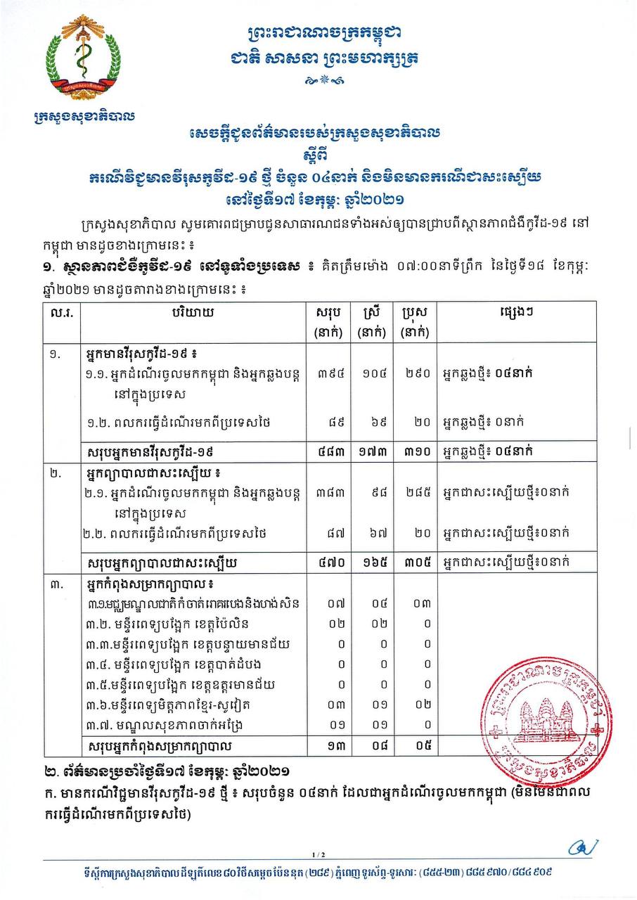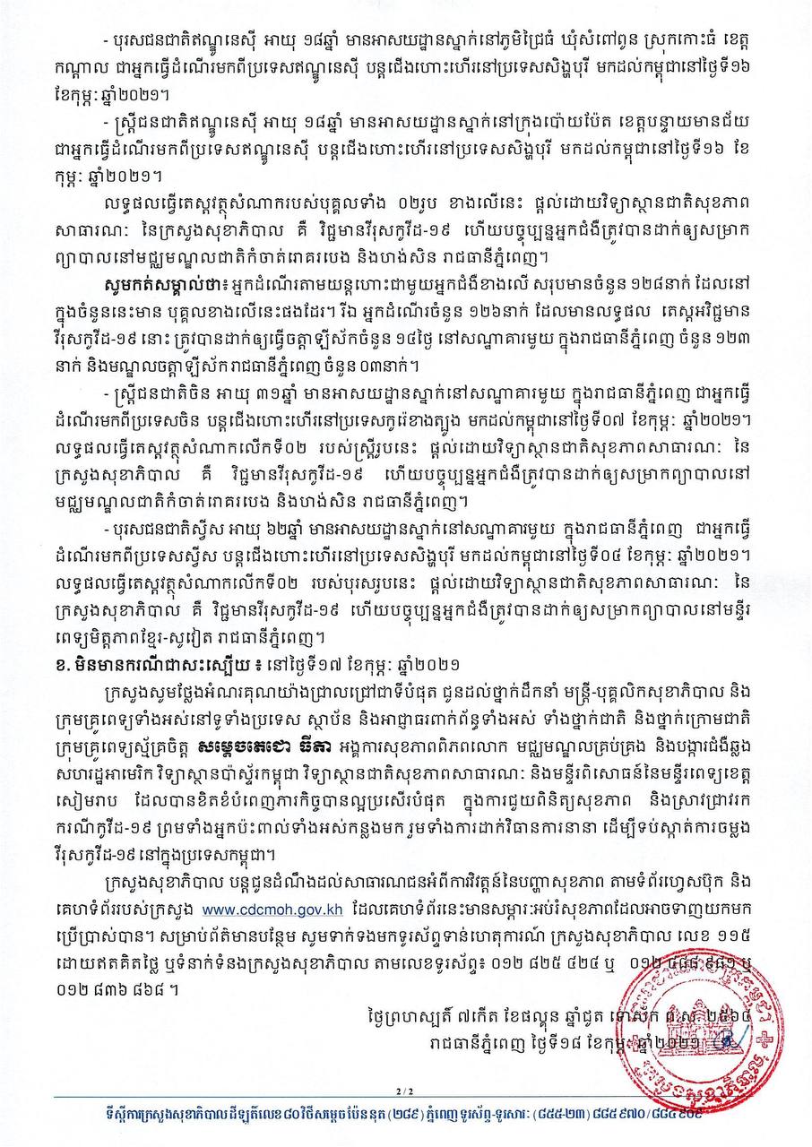 នៅព្រឹកថ្ងៃទី១៨ ខែកុម្ភៈ ឆ្នាំ២០២១នេះ ក្រសួងសុខាភិបាលកម្ពុជា បានចេញសេចក្តីជូនដំណឹងពី ការរកឃើញករណីវិជ្ជមានវីរុសកូវីដ១៩ថ្មី ចំនួន០៤នាក់ និងមិនមានករណីជាសះស្បើយនោះទេ។