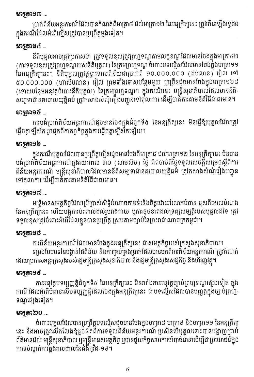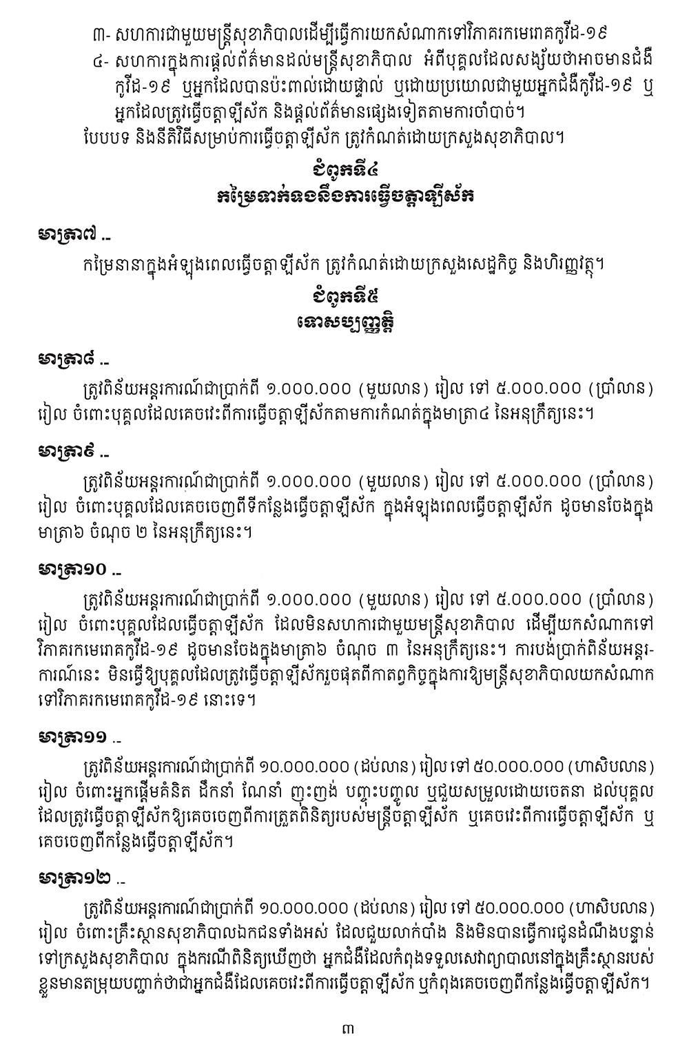 ភ្នំពេញ៖ នៅព្រឹកថ្ងៃទី១៨ ខែកុម្ភៈ ឆ្នាំ២០២១ ប្រមុខរាជរដ្ឋាភិបាល សម្តេចអគ្គមហាសេនាបតី តេជោ ហ៊ុន សែន នាយករដ្ឋមន្ត្រីនៃព្រះរាជាណាចក្រកម្ពុជា បានចេញអនុក្រឹត្យចំនួន២ ដើម្បីបង្កើនការផាកពិន័យលើអ្នកដែលមិនធ្វើចត្តាឡីស័ក និងអ្នកដែលនាំរត់គេចវេះ មិនធ្វើចត្តាឡីស័ក ដោយក្នុងនោះ ទឹកប្រាក់ពិន័យខ្លះមានទំហំទឹកប្រាក់រហូតដល់៥០លានរៀលឯណោះ។