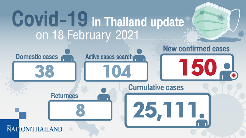 យោងតាមការចុះផ្សាយរបស់សារព័ត៌មាន The Nation Thailand នៅថ្ងៃព្រហស្បតិ៍ ទី១៨ ខែកុម្ភៈ ឆ្នាំ២០២១ បានរាយការណ៍ថា ប្រទេសថៃបានកត់ត្រាករណីជំងឺ COVID-19 ចំនួន ១៥០ករណី ដោយក្នុងនោះមាន ៨ករណី ជាការនាំចូលពីបរទេស។ ពុំមានការស្លាប់ថ្មីត្រូវបានគេរាយការណ៍នោះទេ ដែលធ្វើឱ្យករណីស្លាប់សរុបនៅតែមាន ៨២នាក់ ខណៈការឆ្លងសរុបចាប់តាំងពីជំងឺ COVID-19 មានវត្តមាននៅក្នុងប្រទេសថៃកាលពីឆ្នាំមុន បានកើនឡើងដល់ ២៥,១១១ ករណី។ ករណីជំងឺ COVID-19 សម្រាប់ប្រទេសថៃនៅថ្ងៃនេះគឺមានការចុះថយ ប៉ុន្តែភាគច្រើននៅតែត្រូវបានគេរកឃើញពីខេត្តសាមុតសាខន និងផាធុមថានី។