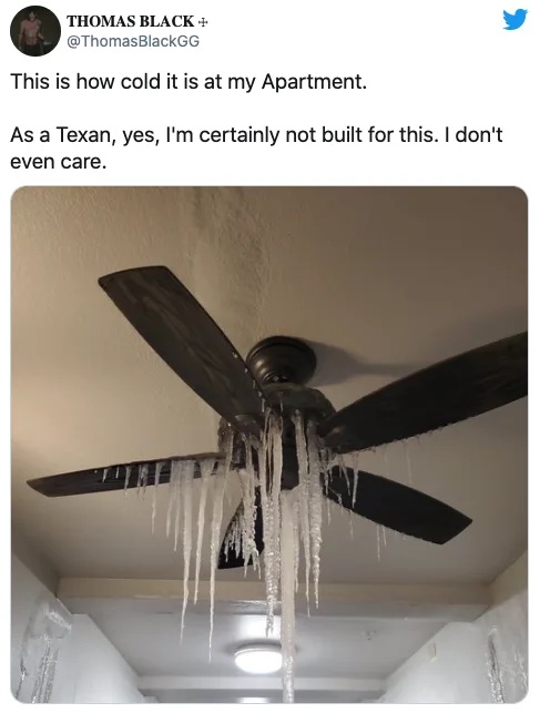 អាមេរិក៖ ពលរដ្ឋរស់នៅក្នុងរដ្ឋតិចសាស់ជាច្រើននាក់បានស្លាប់បាត់បង់ជីវិត និងរាប់លាននាក់ត្រូវគ្មានអគ្គិសនីប្រើប្រាស់ ដោយសារព្យុះទឹកកកធ្វើឲ្យអាកាសធាតុចុះត្រជាក់ខ្លាំងមិនធ្លាប់មានពីមុន។ ចាប់តាំងពីចុងសប្ដាហ៍កន្លងទៅនេះ ផ្នែកខ្លះនៅសហរដ្ឋអាមេរិកបានចុះត្រជាក់រហូតដល់ -១៨ អង្សាសេ ហើយប៉ុន្មានថ្ងៃបន្ទាប់ក្រោយមកពលរដ្ឋប្រមាណ ៣លាននាក់ ត្រូវបាត់បងអគ្គិសនីប្រើប្រាស់ ដែលធ្វើឱ្យពួកគាត់មិនអាចរក្សាកម្ដៅនៅពេលយប់បានឡើយ។