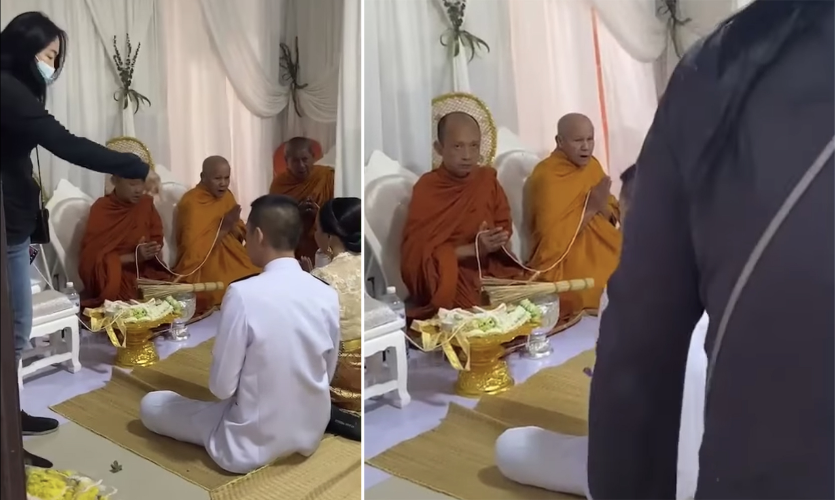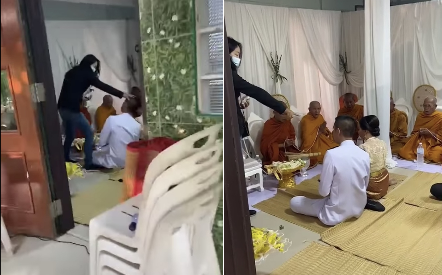 ខឹងកូនលួចការប្រពន្ធថ្មី ម្តាយនាំកូនប្រសារមកអុកឡុកដល់ក្នុងរោងការ ខណៈព្រះសង្ឃកំពុងតែសូត្រមន្តឲ្យពរជ័យ (មានវីដេអូ)