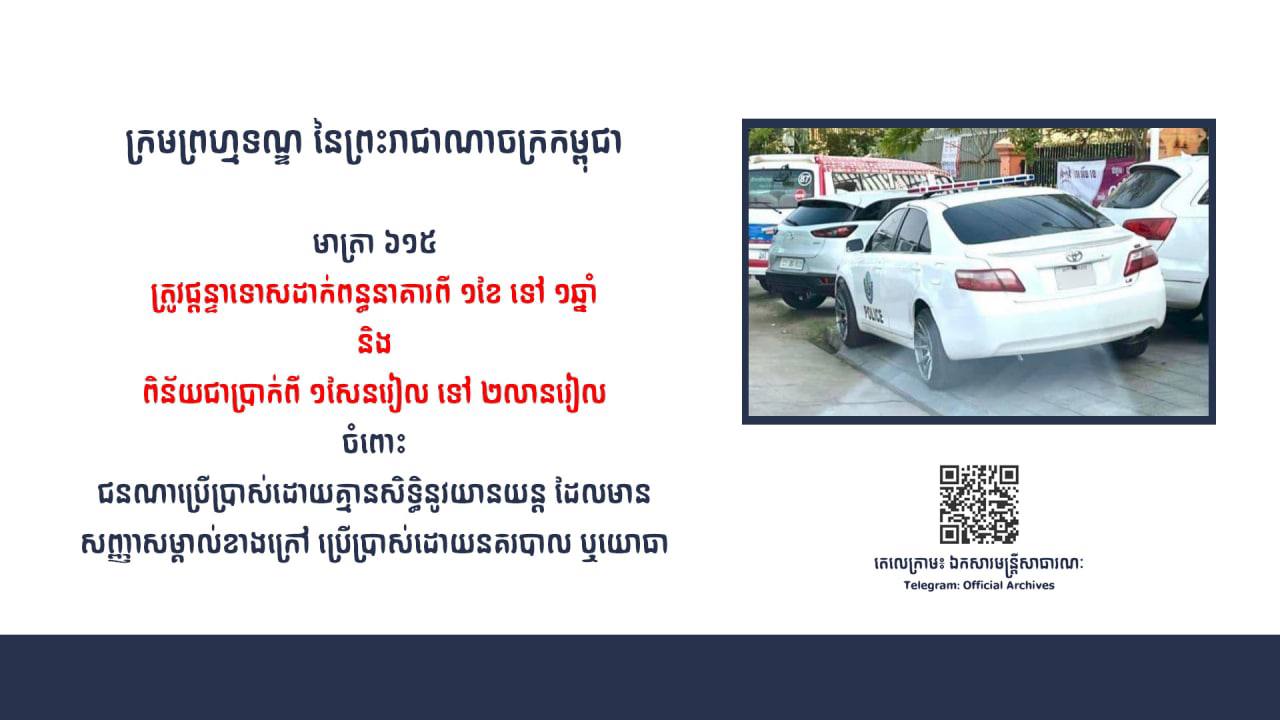 ងាកមើលផ្លូវច្បាប់វិញ! តាមមាត្រា៦១៥ ជនណាប្រើប្រាស់ដោយគ្មានសិទ្ធិនូវយានយន្ត ដែលមានសញ្ញាសម្គាល់ខាងក្រៅ ប្រើប្រាស់ដោយនគរបាល ឬយោធាត្រូវផ្តន្ទាទោសដាក់ពន្ធនាគារពី១ខែទៅ១ឆ្នាំ និងពិន័យជាប្រាក់ពី ១សែនរៀលទៅ ២លានរៀល