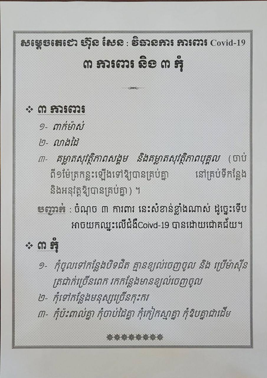 នៅក្នុងនោះដែរ សម្តេចតេជោ ហ៊ុន សែន នាយករដ្ឋមន្ត្រី បានបញ្ជាក់ផងដែរថា សម្តេចមិនមានបទបញ្ជាអោយបិទសាលារៀន រឺកម្មវិធីផ្សេងៗនោះទេ រួមទាំងកម្មវិធីមង្គលការនោះ តែត្រូវបន្តអនុវត្តវិធានការ៣ការពារ និង៣កុំ ឲ្យបានខ្ជាប់ខ្ជួនជានិច្ច៕