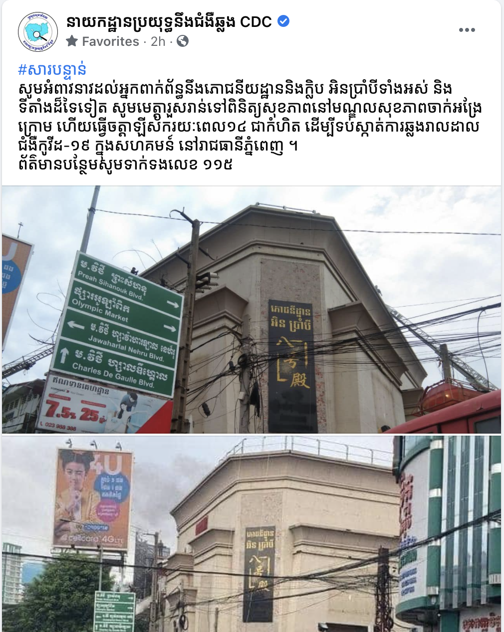 យោងតាមការបង្ហោះរបស់ នាយកដ្ឋានប្រយុទ្ធនឹងជំងឺឆ្លង CDC បានឲ្យដឹងថា៖ “សារបន្ទាន់​ សូមអំពាវនាវដល់អ្នកពាក់ព័ន្ធនឹងភោជនីយដ្ឋាននិងក្លិប អិនប្រាំបីទាំងអស់​ និងទីតាំងដទៃទៀត​ សូមមេត្តារួសរាន់ទៅពិនិត្យសុខភាពនៅមណ្ឌលសុខភាពចាក់អង្រែក្រោម​ ហើយធ្វើចត្តាឡីស័ករយៈពេល១៤ ជាកំហិត ដើម្បីទប់ស្កាត់ការឆ្លងរាលដាលជំងឺកូវីដ-១៩ ក្នុងសហគមន៍ នៅរាជធានីភ្នំពេញ​ ។ ព័ត៌មានបន្ថែមសូមទាក់ទងលេខ​ ១១៥ “៕