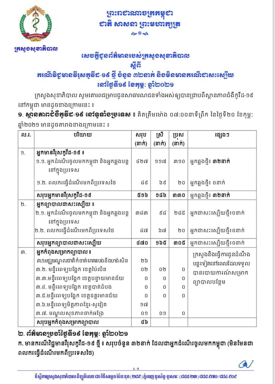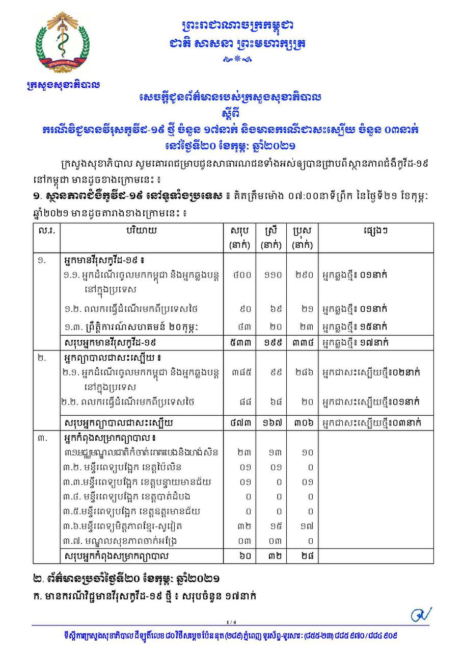 យោងតាមការសេចក្តីជូនព័ត៌មានរបស់ក្រសួងសុខាភិបាល ស្តីពីករណីវិជ្ជមានវីរុសកូវីដ-១៩ ថ្មីចំនួន ១៧នាក់ និងមានករណីជាសះស្បើយចំនួន ៣ នាក់ នៅថ្ងៃទី២០ ខែកុម្ភៈ ឆ្នាំ២០២១ នេះ។ ដែលក្នុងនោះក្រសួងបានអោយដឹងថា ក្រសួងបានរកឃើញវិជ្ជមានថ្មី ១៥នាក់ពាក់ព័ន្ធនឹងព្រឹត្តិការណ៍សហគមន៍២០កុម្ភៈ ១នាក់ធ្វើដំណើរមកពីប្រទេសថៃ និង១នាក់ទៀតជាពលករមកពីប្រទេសថៃ។ ដើម្បីឲ្យជ្រាបច្បាស់សូមប្រិយមិត្តអានព័ត៌មានលំអិតខាងក្រោម៖
