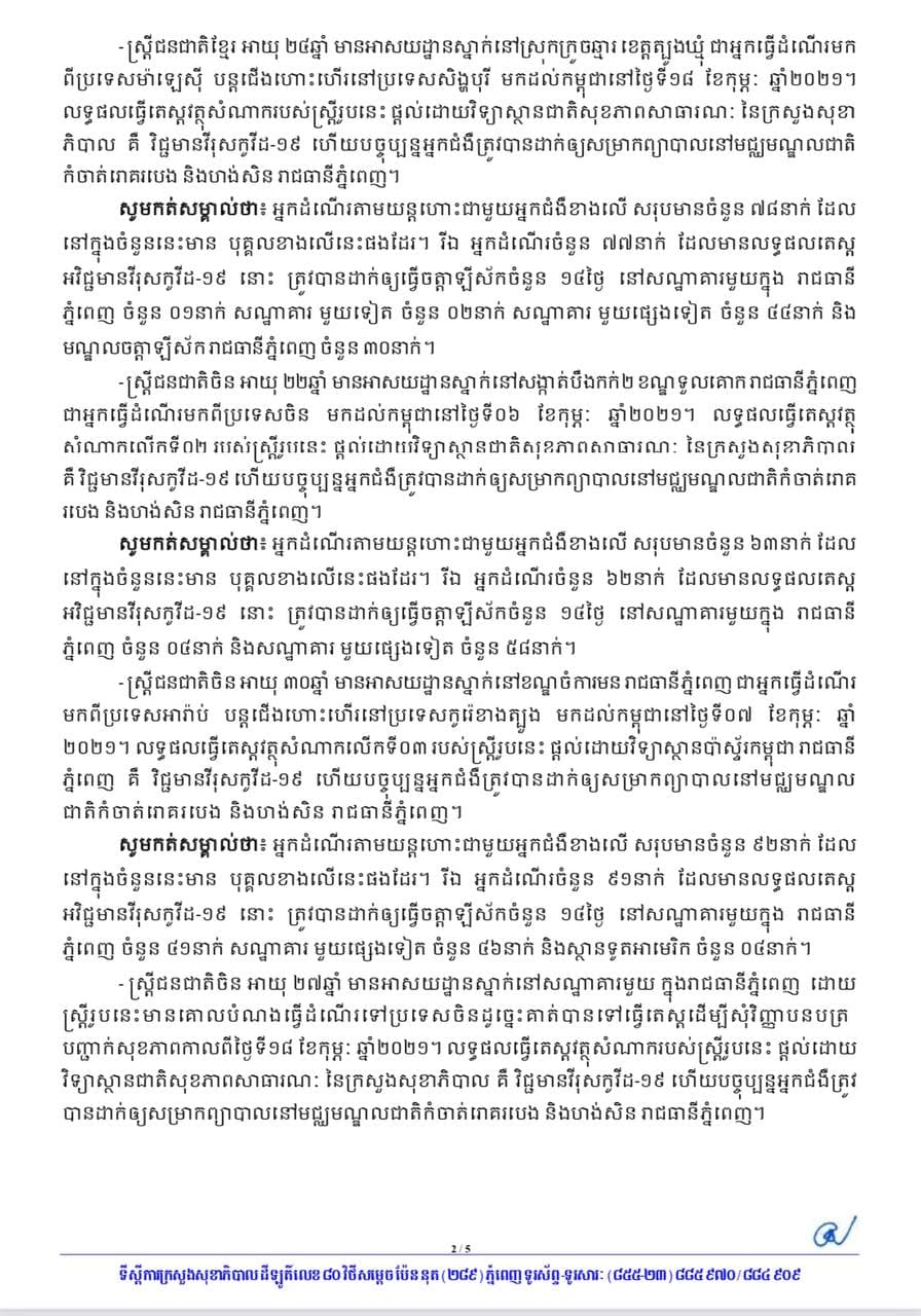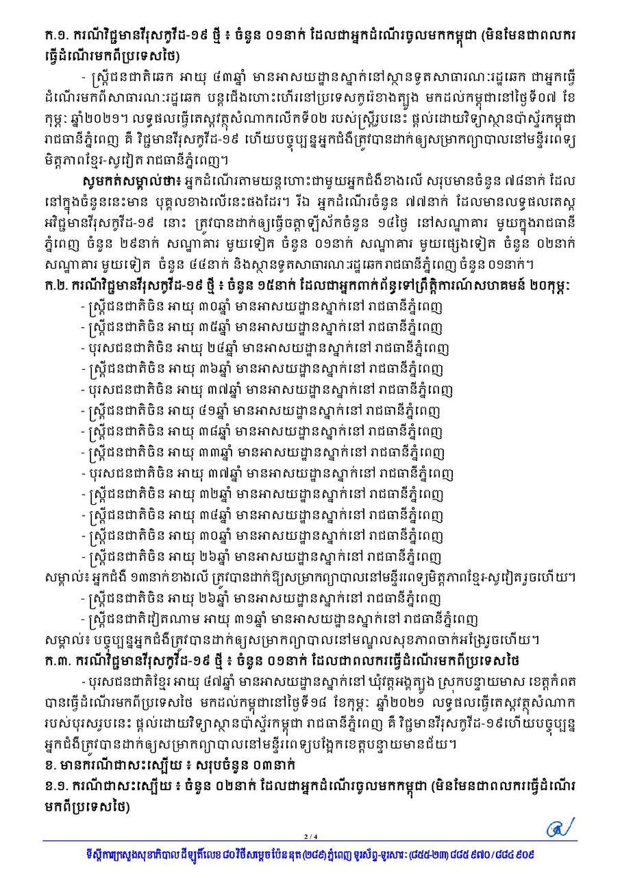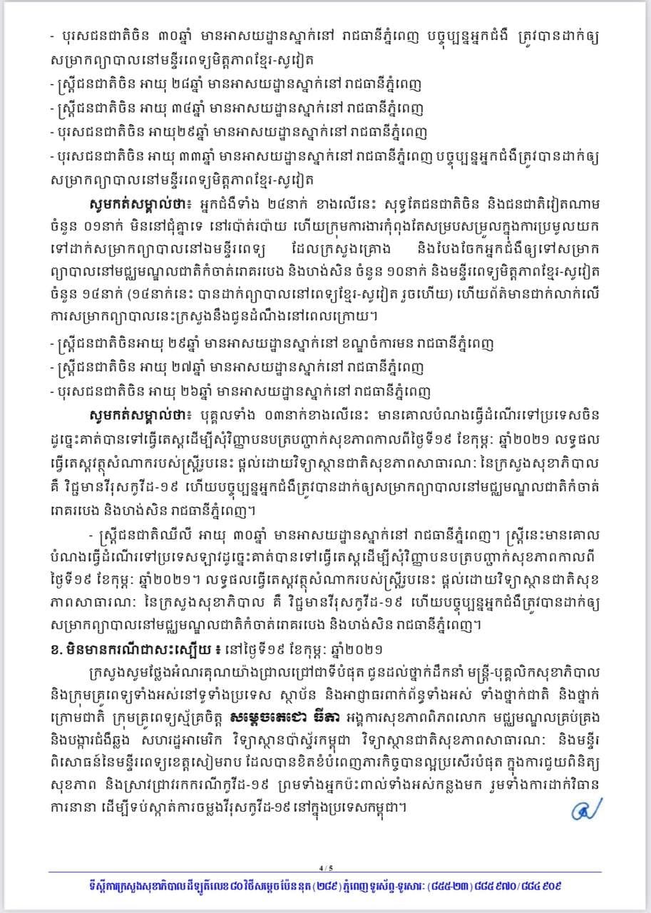 គួរបញ្ជាក់ថា កាលពីម្សិលមិញនេះ ក្រសួងសុខាភិបាល ក៏បានប្រកាសឲ្យដឹងថា មនុស្ស២៤នាក់ ឆ្លងជំងឺកូវីដ-១៩ ពីស្ត្រីជនជាតិចិនម្នាក់ ខណៈពួកគេមិនរស់នៅជុំគ្នា គឺរស់នៅរប៉ាត់រប៉ាយ ហើយមួយចំនួនជាអ្នកធ្វើការក្នុងក្លឹបកំសាន្ត ។ យោងតាមការសេចក្តីជូនព័ត៌មានរបស់ក្រសួងសុខាភិបាល ស្តីពីករណីវិជ្ជមានវីរុសកូវីដ-១៩ ថ្មីចំនួន ៣២នាក់ ដែលបានរកឃើញនៅថ្ងៃទី១៩ ខែកុម្ភៈ ឆ្នាំ២០២១ បានអោយដឹងថា ក្រសួងបានរកឃើញវិជ្ជមានថ្មី៣នាក់លើអ្នកដំណើរដែលធ្វើដំណើរពីក្រៅប្រទេសចូលមកកម្ពុជា និងរកឃើញករណីវិជ្ជមានថ្មីម្នាក់លើស្ត្រីជនជាតិចិន ដែលគ្រោងធ្វើដំណើរទៅប្រទេសចិនវិញ ហើយស្ត្រីជនជាតិចិនរូបនេះបានចម្លង មនុស្ស២៤នាក់ផ្សេងទៀត ដែលជាអ្នកប៉ះពាល់ជាមួយនាង។