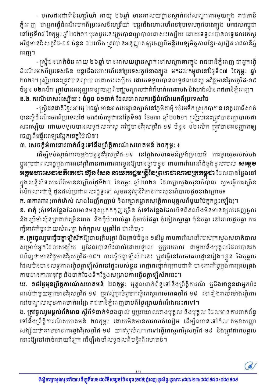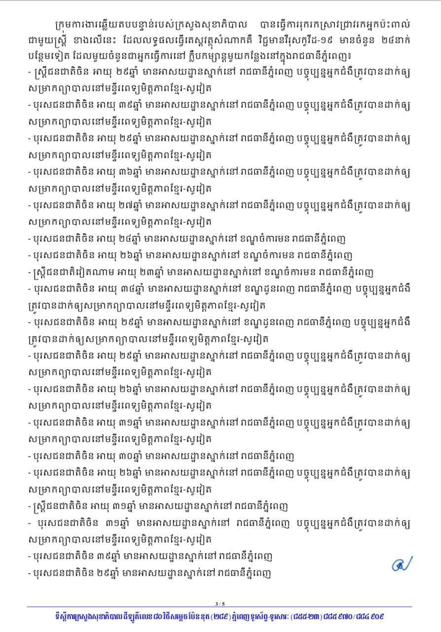 ក្នុងនោះដែរក្រសួងក៏បានរកឃើញវិជ្ជមានថ្មីជនជាតិ៣នាក់ទៀត ដែលគ្រោងធ្វើដំណើរទៅប្រទេសចិន និងបានធ្វើតេស្តសុំវិញ្ញាបនបត្របញ្ជាក់សុខភាពកាលពីថ្ងៃទី១៩ ហើយក៏បានរកឃើញវិជ្ជមានថ្មីលើស្ត្រីជនជាតិ ឈីលី ម្នាក់ទៀតដែលគ្រោងធ្វើដំណើរទៅប្រទេសឡាវ និងបានធ្វើតេស្តសុំវិញ្ញាបនបត្របញ្ជាក់សុខភាពកាលពីថ្ងៃទី១៩។