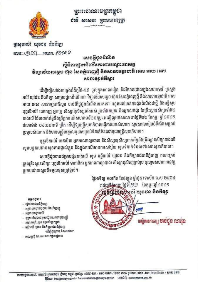 យោងតាមសេចក្តីជូនដំណឹងរបស់ក្រសួងអប់រំ យុវជន និងកីឡា ដែលក្រុមការងារយើងទទួលបានមុននេះបន្តិចបានអោយដឹងថា ក្រសួងបានសម្រេចផ្អាកដំណើរការបណ្តោះអាសន្ន វិទ្យាល័យសម្តេច ហ៊ុន សែន ភ្នំពេញថ្មី និងសាលាអន្តរជាតិ SIS សាខាឡាក់គីស្តារ ចាប់ពីថ្ងៃជូនដំណឹងនេះតទៅ។