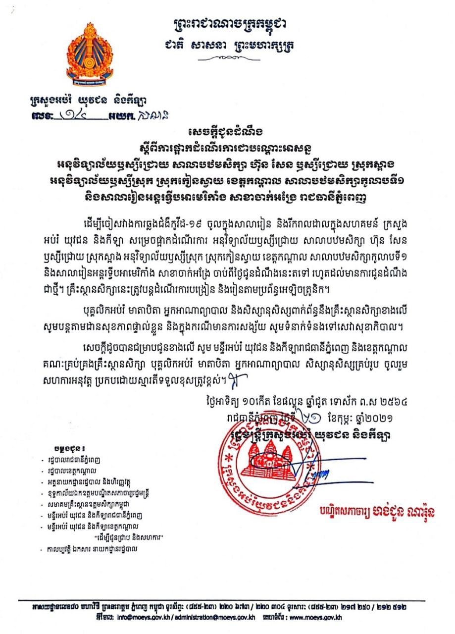យោងតាមសេចក្តីជូនដំណឹងរបស់ក្រសួងអប់រំ យុវជន និងកីឡា ដែលក្រុមការងារយើងទទួលបានមុននេះបន្តិចបានអោយដឹងថា ក្រសួងបានសម្រេចផ្អាកដំណើរការបណ្តោះអាសន្ន អនុវិទ្យាល័យឫស្សីជ្រោយ សាលាបឋមសិក្សា ហ៊ុន សែន ឫស្សីជ្រោយ ស្រុកស្អាង អនុវិទ្យាល័យឫស្សីស្រុក ស្រុកកៀនស្វាយ ខេត្តកណ្ដាល សាលាបឋមសិក្សាកូលាបទី១ និងសាលារៀនអន្តរទ្វីបអាមេរិកាំង សាខាចាក់អង្រែ រាជធានីភ្នំពេញ ដើម្បីចៀសវាងការឆ្លងជំងឺកូវីដ-១៩ ចូលក្នុងសាលារៀន និងរីករាលដាលក្នុងសហគមន៍។