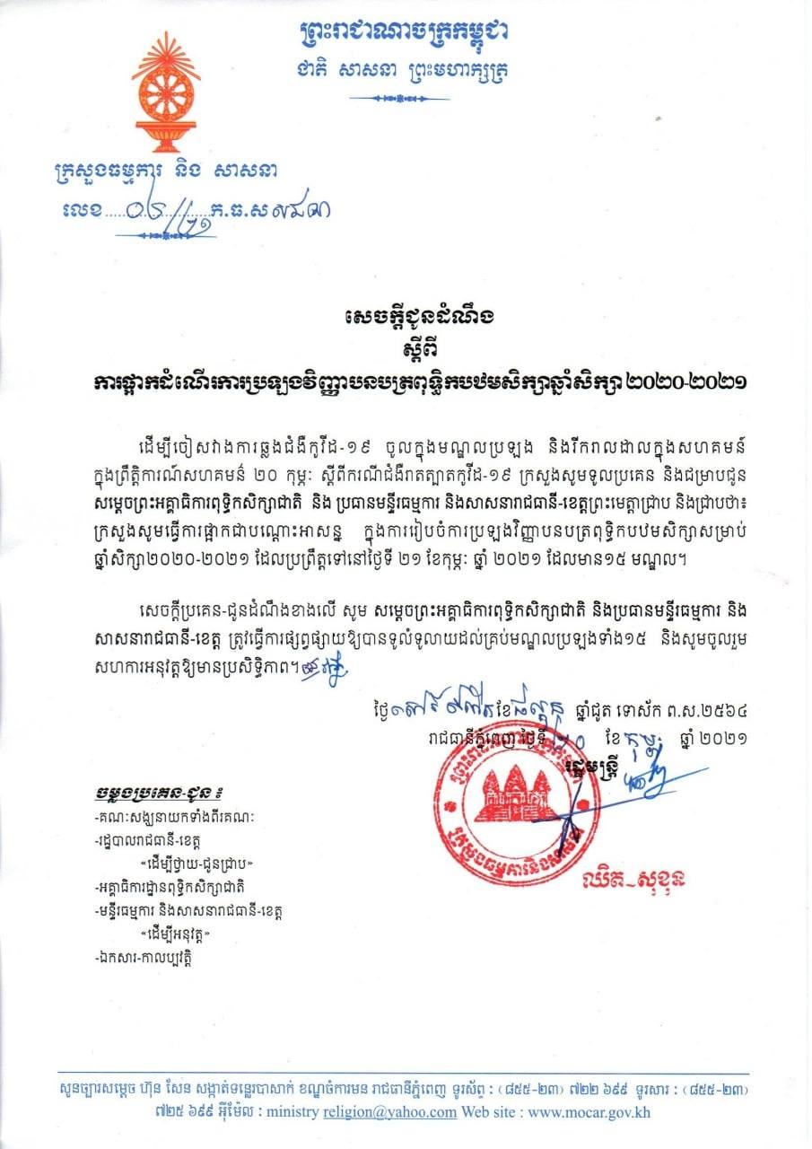 ក្រសួងធម្មការ និងសាសនា សម្រេចផ្អាកដំណើរការប្រឡងវិញ្ញាបនបត្រពុទ្ធិកបឋមសិក្សា ឆ្នាំសិក្សា២០២០-២០២១