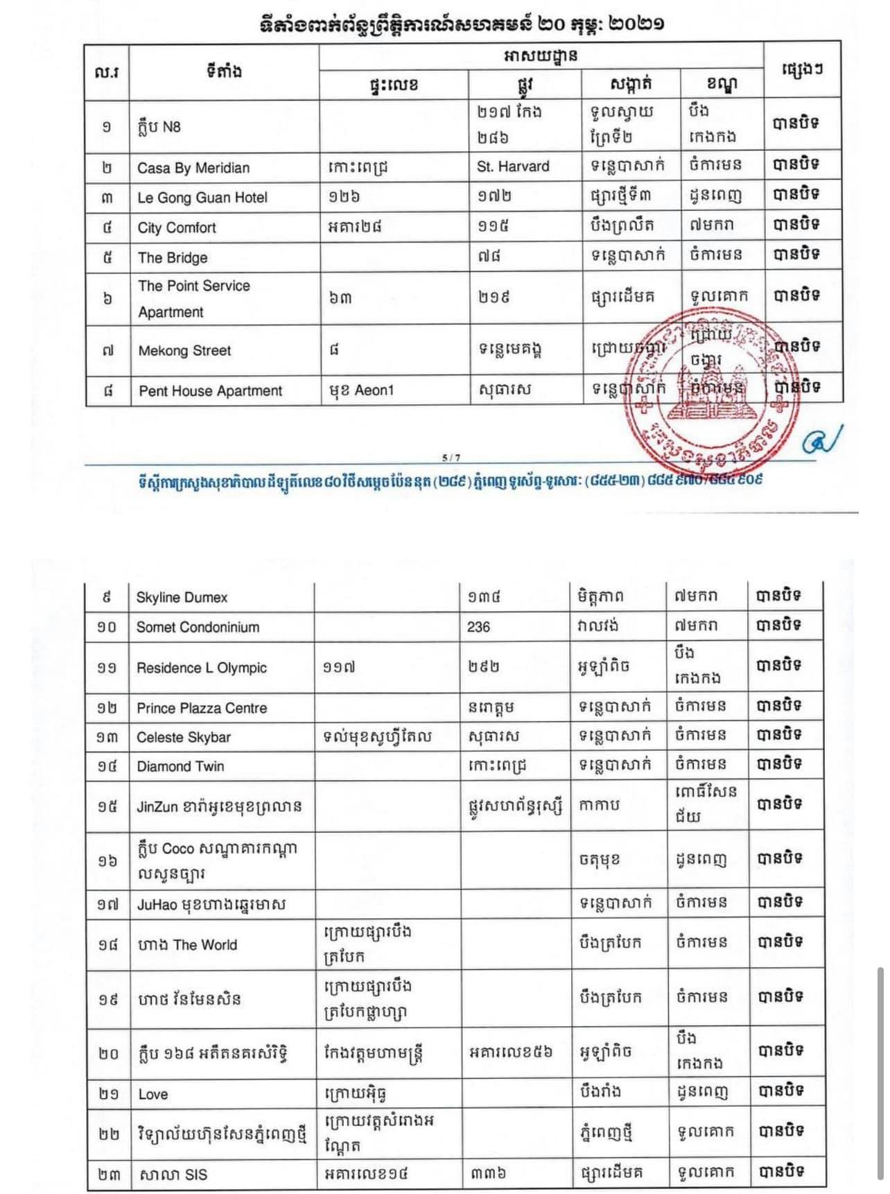 រាជធានីភ្នំពេញ៖ ក្រសួងសុខាភិបាល និងសាលារាជធានីភ្នំពេញ បានធ្វើការអំពាវនាវឲ្យអ្នករត់ឡានតាក់ស៊ី និងម៉ូតូកង់បីទាំងអស់ ដែលធ្លាប់បានដឹកភ្ញៀវនៅតាម ២៣ទីតាំងដែលពាក់ព័ន្ធនឹងព្រឹត្តិការណ៍ សហគមន៍២០កុម្ភៈ សូមប្រញាប់មកធ្វើតេស្តរកជំងឺកូវីដ១៩ នៅស្តាតអូឡាំពិក នាវេលាម៉ោង ២រសៀលថ្ងៃទី២២ ខែកុម្ភៈ ឆ្នាំ២០២១នេះ។ ទីតាំងទាំង២៣ ដែលពាក់ព័ន្ធនឹងព្រឹត្តិការណ៍ សហគមន៍ ២០កុម្ភៈ រួមមាន៖