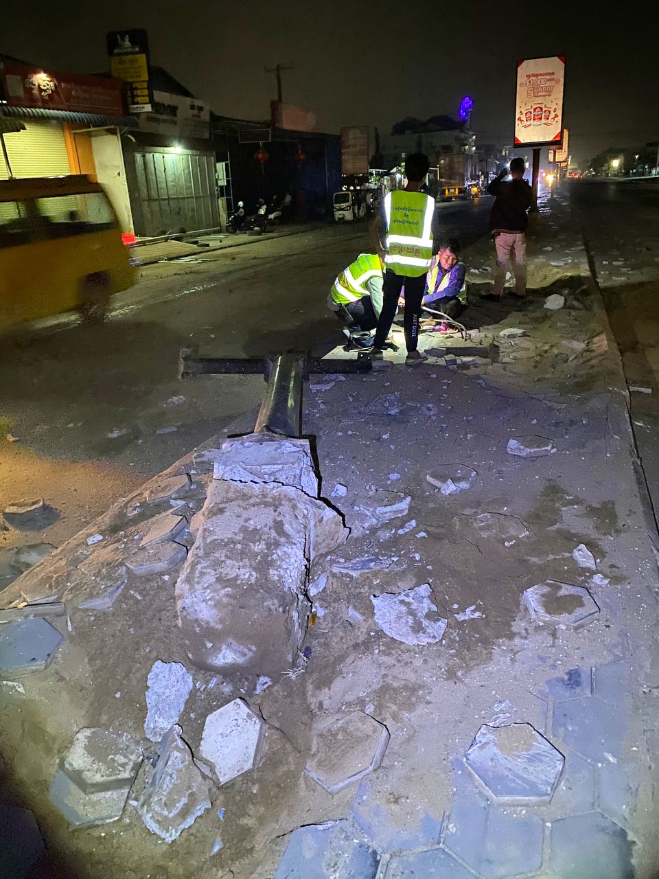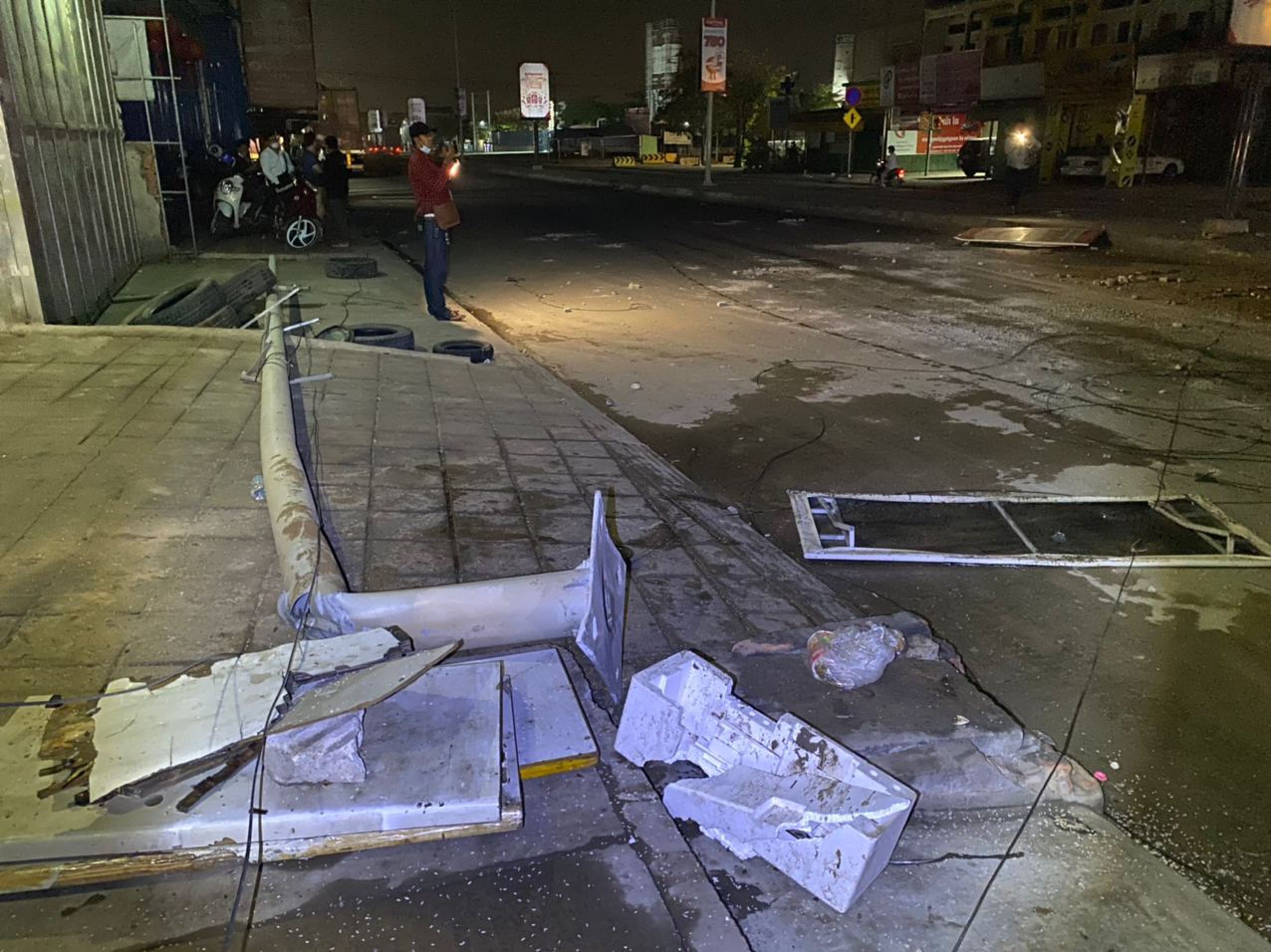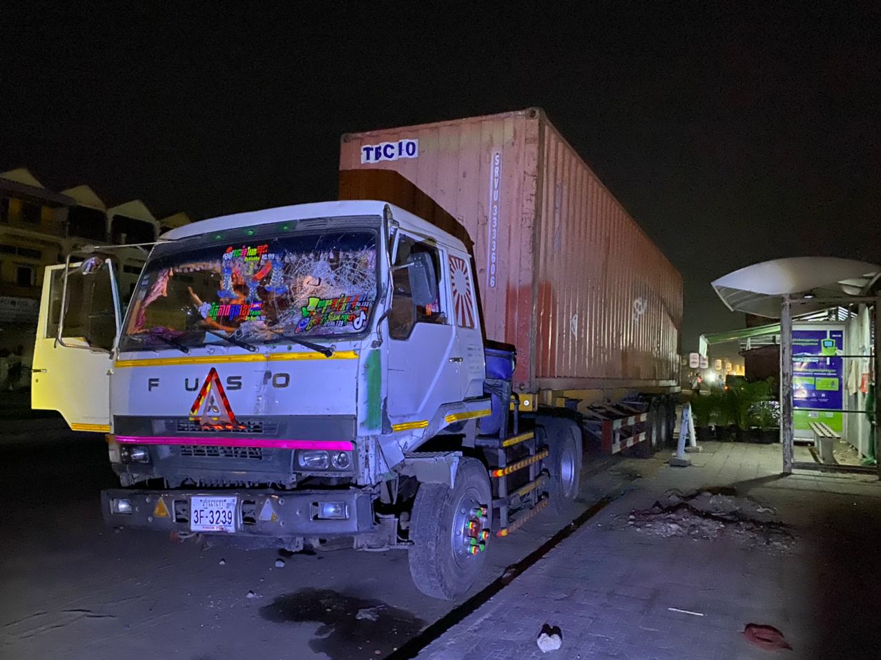 រាជធានីភ្នំពេញ ៖ បង្គោលចរាចរណ៍ បង្គោលប៉ាណូ និងបង្គោលភ្លើងបំភ្លឺផ្លូវ បាក់រាបដល់ដី ព្រមទាំងឥដ្ឋការ៉ូឡារៀបនៅលើខឿនចែកទ្រូវផ្លូវ រងការខូចខាតបែកបាក់រាយប៉ាយពេញផ្លូវ ដែលបង្កឡើងដោយរថយន្តសណ្ដោងកុងតឺន័រមួយគ្រឿង បោះពួយលឿនពេក រេចង្កូតឡើងលើខឿនចែកទ្រូវផ្លូវបុករះប៉ើងខ្ទាតពេញផ្លូវ ។ ហេតុការណ៍គ្រោះថ្នាក់ចរាចរណ៍ដ៏សាហាវនេះបានកើតឡើងកាលពីវេលាម៉ោង០២:៤០នាទីរំលងអធ្រាត្រ ឈានចូលថ្ងៃពុធ ទី២៤ ខែកុម្ភៈ ឆ្នាំ២០២១ នៅក្បែរច្រកចូលស្នាក់ការប៉ុស្តិ៍នគរបាលចោមចៅទី២ ស្ថិតនៅតាមបណ្តោយផ្លូវចោមចៅ(ផ្លូវវេងស្រេង) ភូមិចោមចៅ សង្កាត់ចោមចៅទី២ ខណ្ឌពោធិ៍សែនជ័យ រាជធានីភ្នំពេញ។