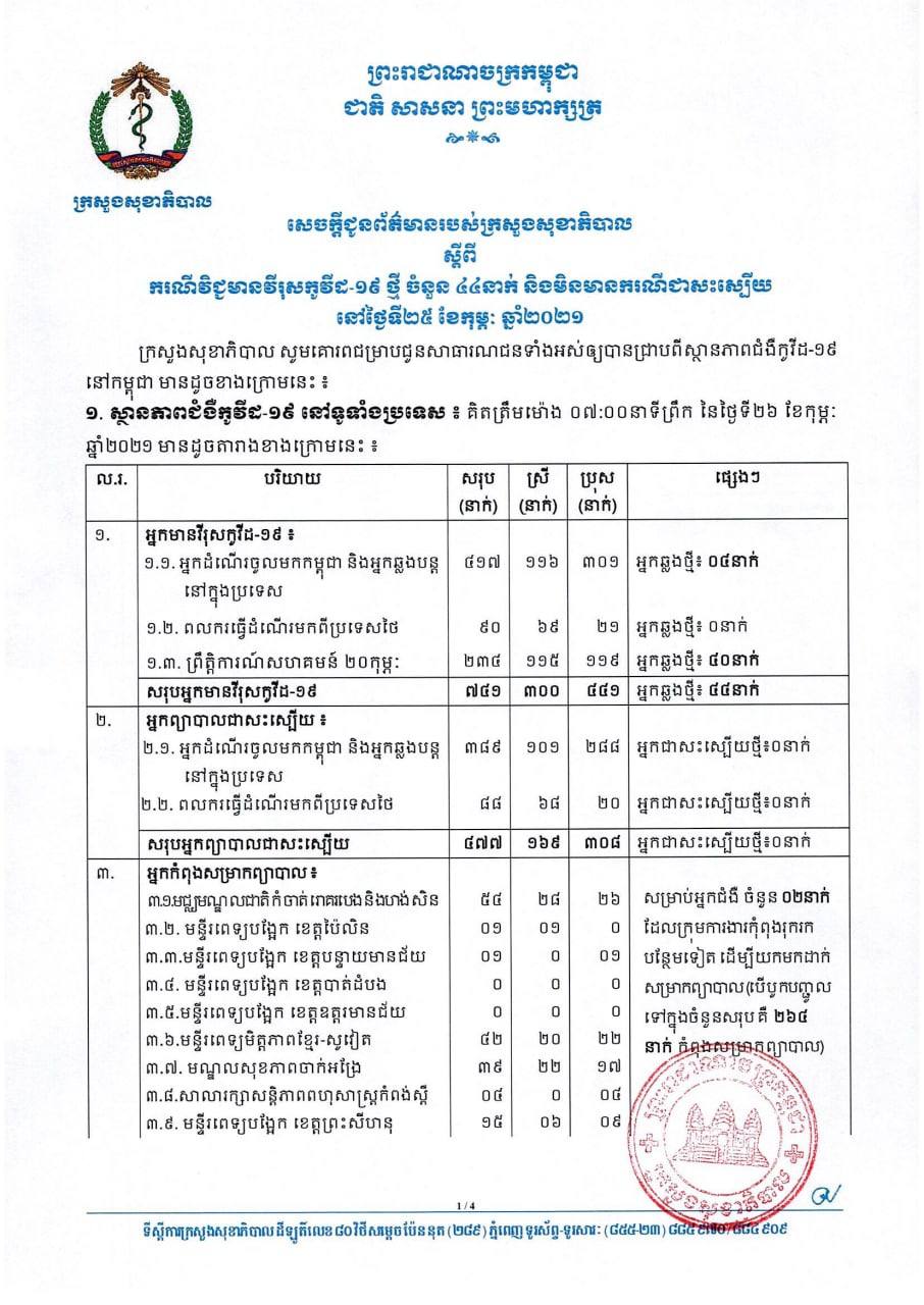 នៅព្រឹកថ្ងៃទី២៦ ខែកុម្ភៈ ឆ្នាំ២០២១នេះ ក្រសួងសុខាភិបាលកម្ពុជា បានចេញសេចក្តីជូនដំណឹងពី ការរកឃើញករណីវិជ្ជមានវីរុសកូវីដ១៩ថ្មី ចំនួន៤៤នាក់ និងមិនមានករណីជាសះស្បើយថ្មីនោះទេ។ យោងតាមសេចក្តីប្រកាសរបស់ក្រសួងសុខាភិបាល បានបញ្ជាក់ថា អ្នកវិជ្ជមានទាំង៤៤នាក់នោះ គឺមាន០៤នាក់ជាអ្នកដំណើរចូលមកកម្ពុជា និង៤០នាក់ទៀតជាអ្នកពាក់ព័ន្ធព្រឹត្តិការណ៍ សហគមន៍២០កុម្ភៈ ហើយសុទ្ធតែជាអ្នករស់នៅក្នុងរាជធានីភ្នំពេញ និងខេត្តព្រះសីហនុ។