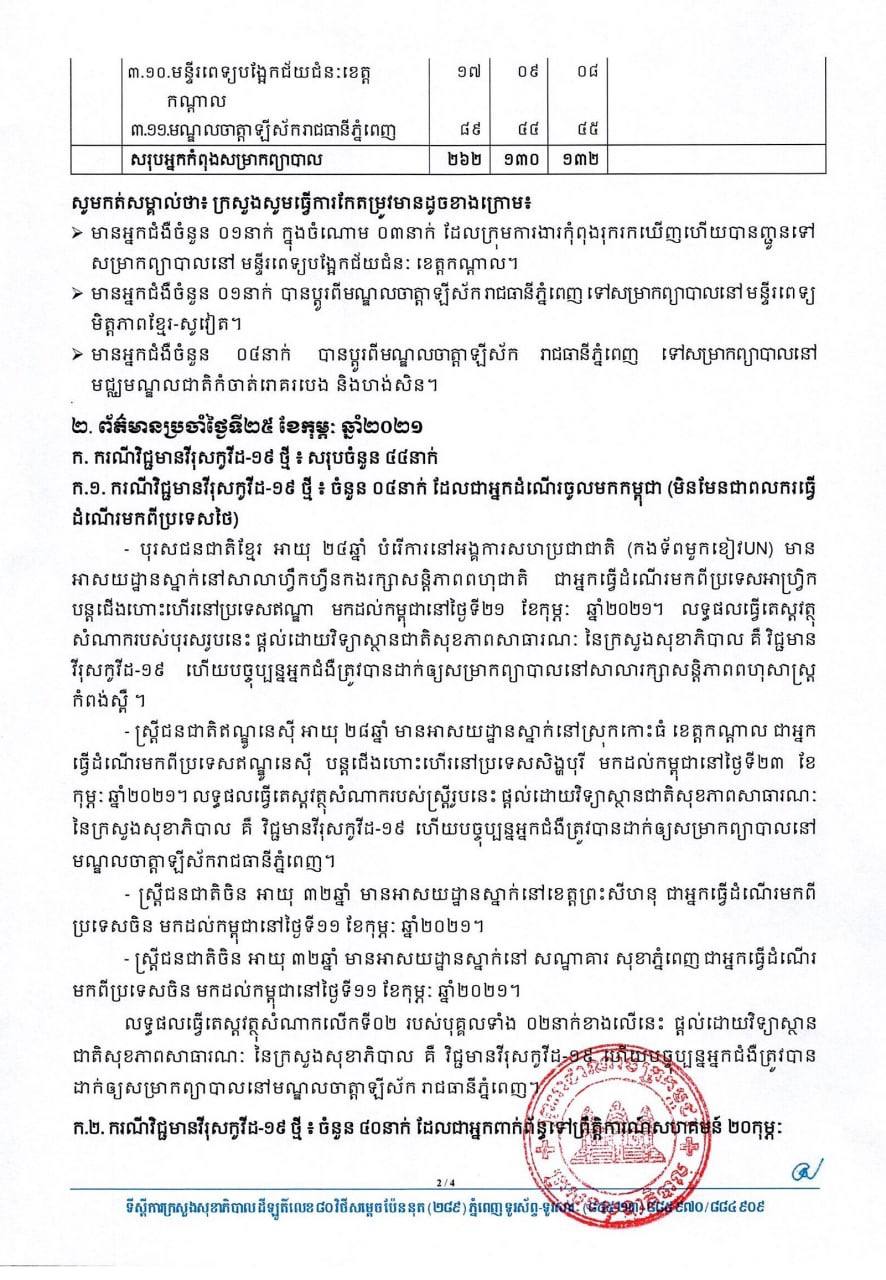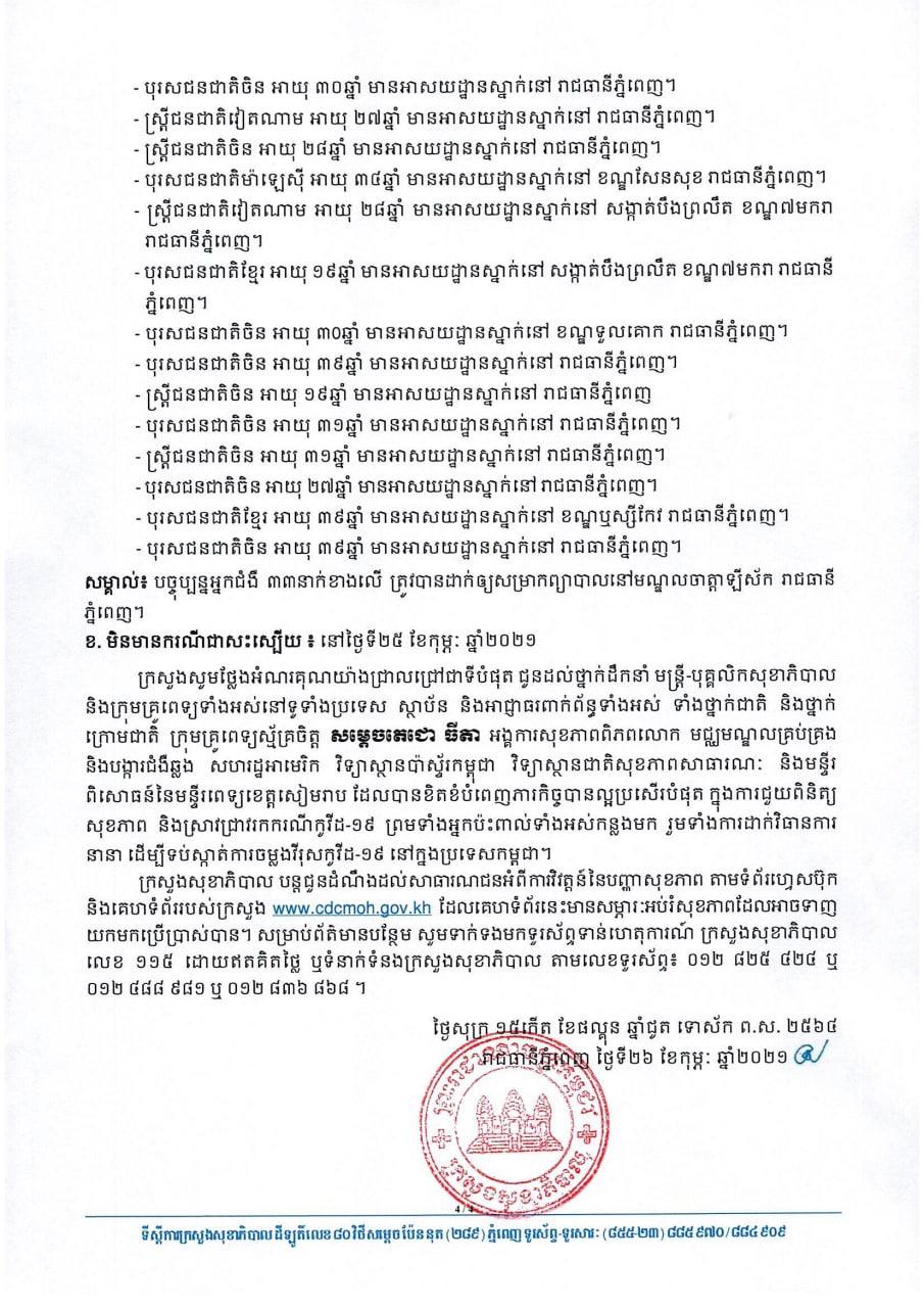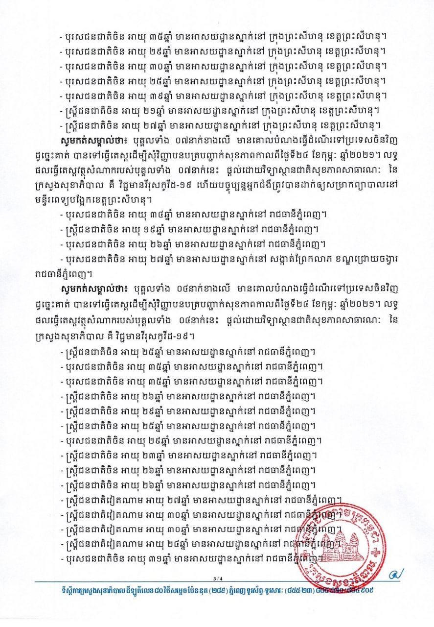 ក្នុងនោះផងដែរ ក្រសួងសុខាភិបាលរកឃើញមានជនជាតិចិនចំនួន១១នាក់ (នៅខេត្តព្រះសីហនុចំនួន ០៧នាក់ និងរាជធានីភ្នំពេញ ០៤នាក់) ដោយមានបំណងធ្វើដំណើរទៅប្រទេសចិនវិញ ដូច្នេះពួកគាត់បានទៅធ្វើតេស្ត ដើម្បីសុំវិញ្ញាបនបត្របញ្ជាក់សុខភាពកាលពីថ្ងៃទី២៤ ខែកុម្ភៈ ឆ្នាំ២០២១។ លទ្ធផលធ្វើតេស្តវត្ថុសំណាករបស់ពួកគាត់ទាំង១១នាក់ ផ្តល់ដោយវិទ្យាស្ថានជាតិសុខភាពសាធារណៈ នៃក្រសួងសុខាភិបាល គឺវិជ្ជមានវីរុសកូវីដ១៩ ហើយបច្ចុប្បន្នអ្នកជំងឺចំនួន ០៧នាក់នៅខេត្តព្រះសីហនុ ត្រូវបានដាក់ឲ្យសម្រាកព្យាបាលនៅមន្ទីរពេទ្យបង្អែកខេត្តព្រះសីហនុ ចំណែកឯអ្នកជំងឺចំនួន ០៤នាក់នៅរាជធានីភ្នំពេញ ត្រូវបានដាក់ឲ្យសម្រាកព្យាបាលនៅមណ្ឌលចត្តាឡីស័ក រាជធានីភ្នំពេញ។ សូមអានសេចក្តីជូនព័ត៌មាននៅខាងក្រោម៖