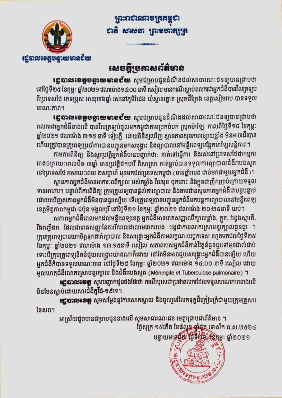 រដ្ឋបាលខេត្តបន្ទាយមានជ័យ ចេញសេចក្តីប្រកាសព័ត៌មានស្តីពី ករណីពលករម្នាក់បានស្លាប់ក្រោយពេលវិលត្រឡប់ពីប្រទេសថៃ