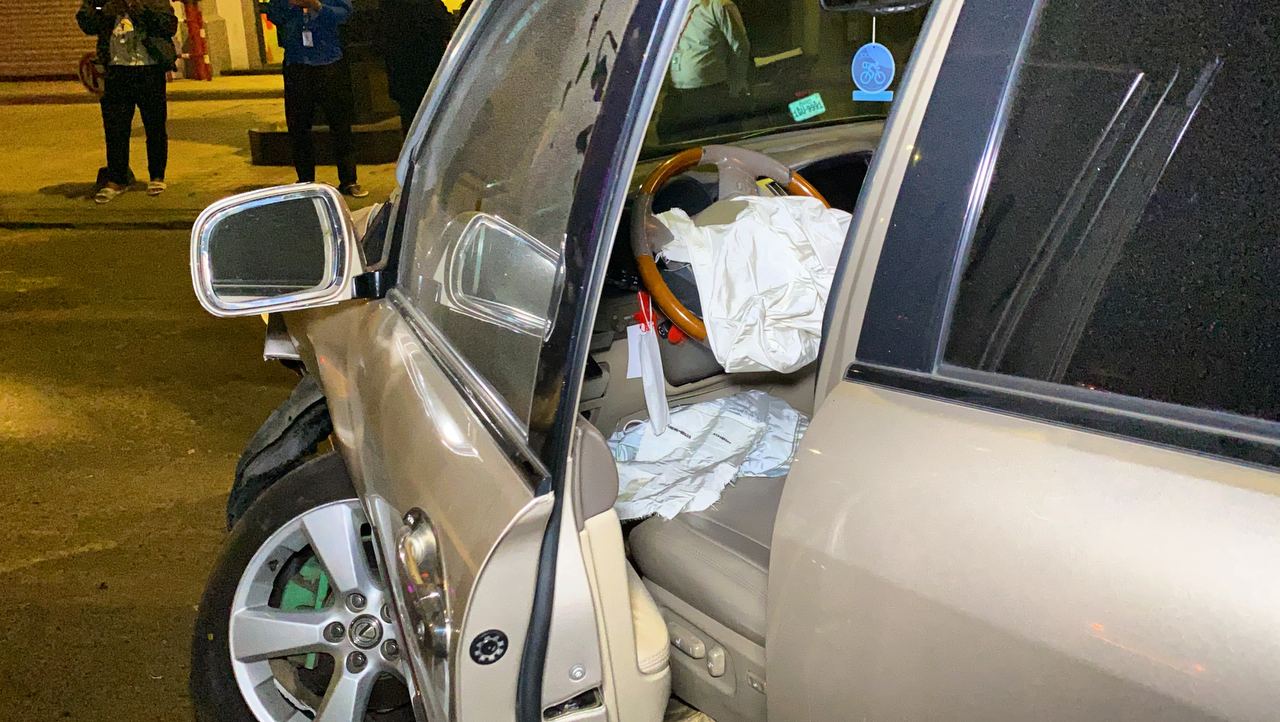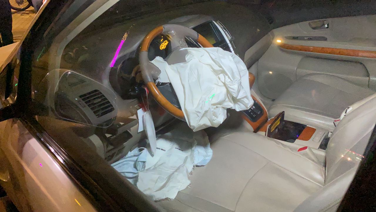 រថយន្តឡិចស៊ីសស៊េរីទំនើបបើកយ៉ាងលឿនរេចង្កូតទៅបុករបាំងថ្មពុះចែកផ្លូវខ្ទាតទៅកណ្ដាល ឯរថយន្តផ្ទុះកង់ និងបាក់កាឡេបើកលែងរួច