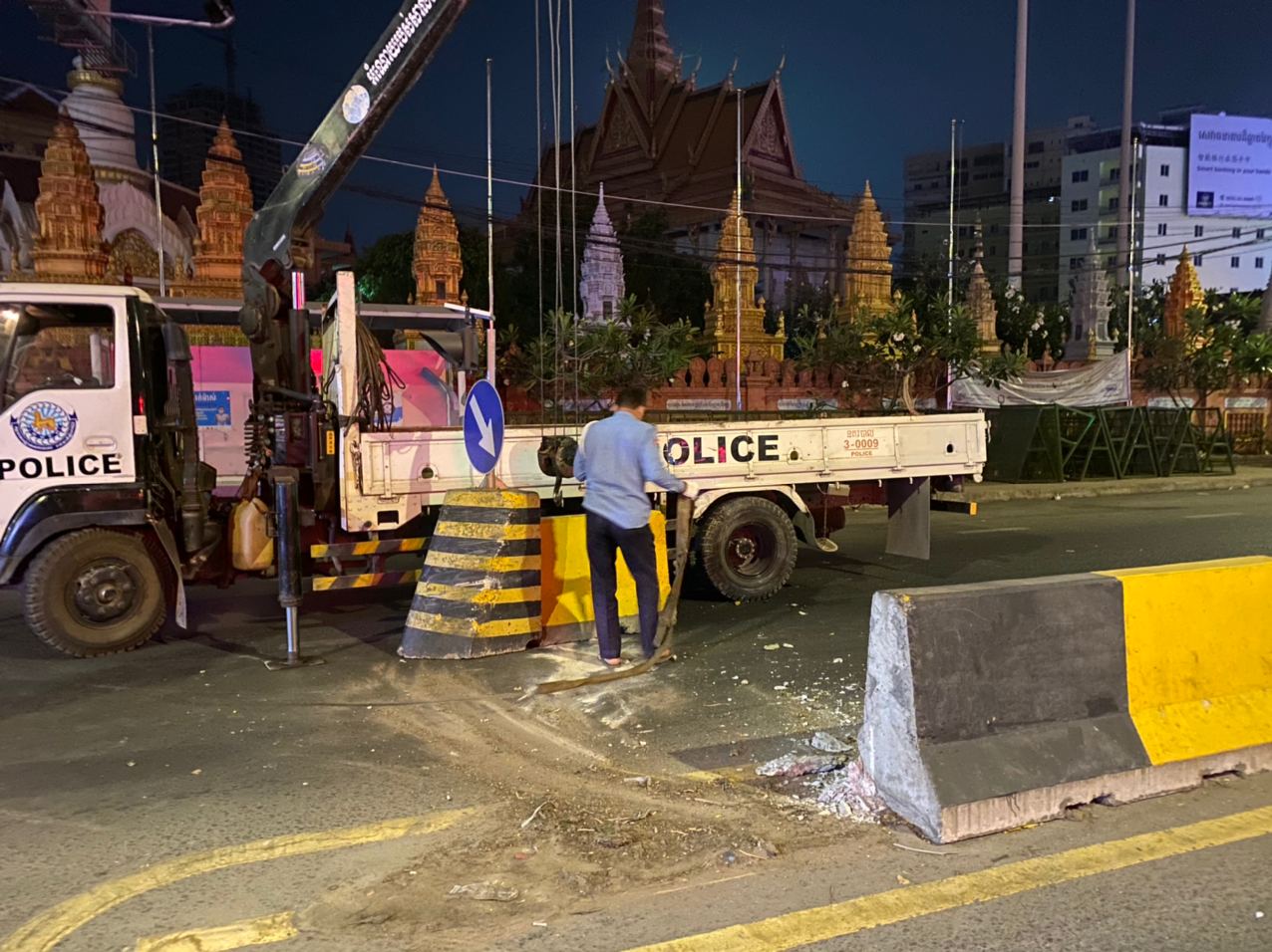 ក្រោយកើតហេតុ គេឃើញសមត្ថកិច្ចប៉ុស្តិ៍វាលវង់ និងកម្លាំងផ្នែកវាស់វែងចរាចរណ៍នៃអធិការដ្ឋាននគរបាលខណ្ឌ៧មករា បានចុះមកកន្លែងកើតហេតុជួយអន្តរាគមន៍ បញ្ជៀសចរាចរណ៍ និងពិនិត្យមើលរួចទាក់ទងប្រគល់ឲ្យខាងជំនាញចុះមកសហការគ្នា និងបានជួយស្ទូចយករបាំងថ្មទ្រូងផ្លូវដែលខ្ទាតទៅកណ្ដាលផ្លូវនោះ ទៅដាក់កន្លែងដើមវិញ និងបន្តធ្វើការវាស់វែងនិងស្ទូចយករថយន្តបង្កទៅរក្សាទុកបណ្ដោះអាសន្ន នៅការិយាល័យចរាចរណ៍ផ្លូវគោក នៃស្នងការដ្ឋាននគរបាលរាជធានីភ្នំពេញ ដើម្បីរង់ចាំធ្វើការដោះស្រាយ សងការខូចខាតទ្រព្យសម្បត្តិរដ្ឋតាមផ្លូវច្បាប់ ៕