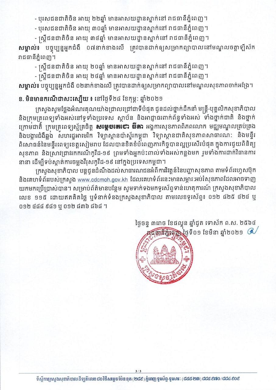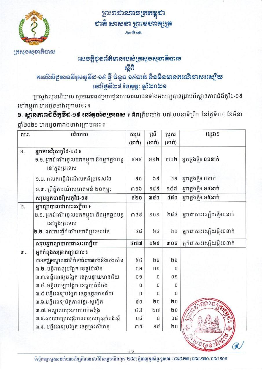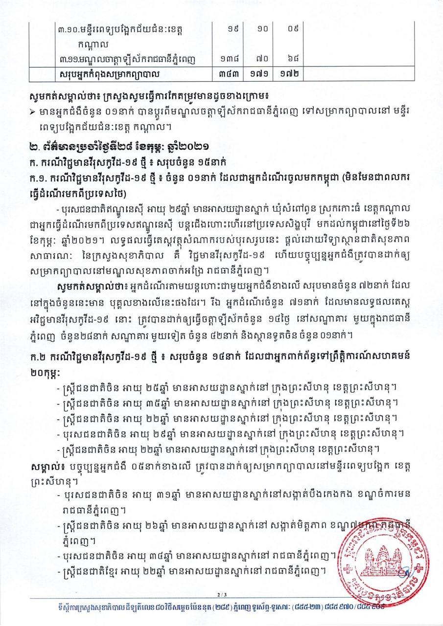 យោងតាមសេចក្តីប្រកាសរបស់ក្រសួងសុខាភិបាល បានបញ្ជាក់ថា អ្នកវិជ្ជមានទាំង១៥នាក់នោះ គឺមាន០១នាក់ជាអ្នកដំណើរចូលមកកម្ពុជា និង១៤នាក់ទៀតជាអ្នកពាក់ព័ន្ធព្រឹត្តិការណ៍ សហគមន៍២០កុម្ភៈ ហើយសុទ្ធតែនៅក្នុងរាជធានីភ្នំពេញ និងខេត្តព្រះសីហនុ។ សូមអានសេចក្តីជូនព័ត៌មាននៅខាងក្រោម៖