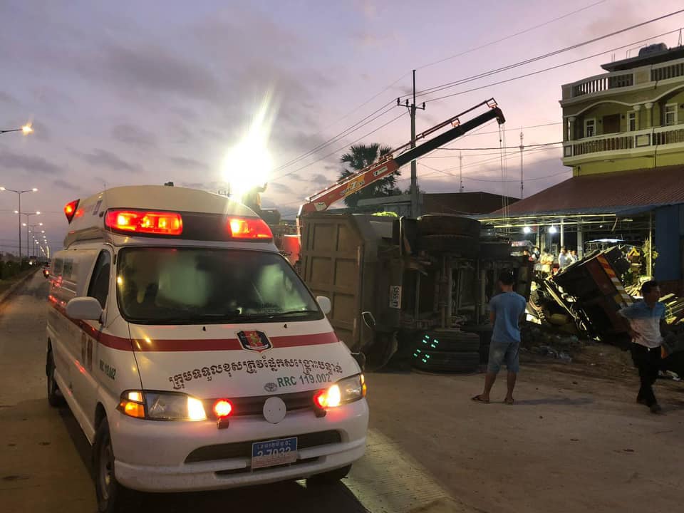 ភ្នំពេញ៖​ កងសង្គ្រោះបន្ទាន់៧១១​ បានចេញមកជួយសង្គ្រោះ​ ករណីគ្រោះថ្នាក់ចរាចរណ៍ដ៏រន្ធត់​រវាងរថយន្តបែនដឹកថ្មផេះ បើកលឿនបានជ្រុលទៅបុករថយន្តដឹកមេសុីម៉ងត៍ពេញទំហឹង បណ្តាលឲ្យក្រឡាប់ធ្លាក់ផ្លូវ គៀបជាប់តៃកុងម្នាក់។ សូមជំរាប​ផងដែរថា កងសង្រ្គោះបន្ទាន់៧១១​ បានបញ្ចេញ​រថយន្ត​ស្ទូច​ និងម៉ាសុីនកាត់ដែក ដេីម្បីជួយសង្គ្រោះតៃកុងដែលគៀបជាប់ក្នុងរថយន្ត។