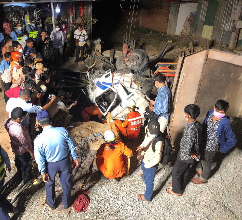 រថយន្តបែនដឹកថ្ម បើកលឿនជ្រុលបុករថយន្តដឹកស៊ីម៉ងត៍ពេញទំហឹង បណ្តាលឲ្យក្រឡាប់ធ្លាក់ផ្លូវ គៀបជាប់តៃកុងក្នុងរថយន្ត