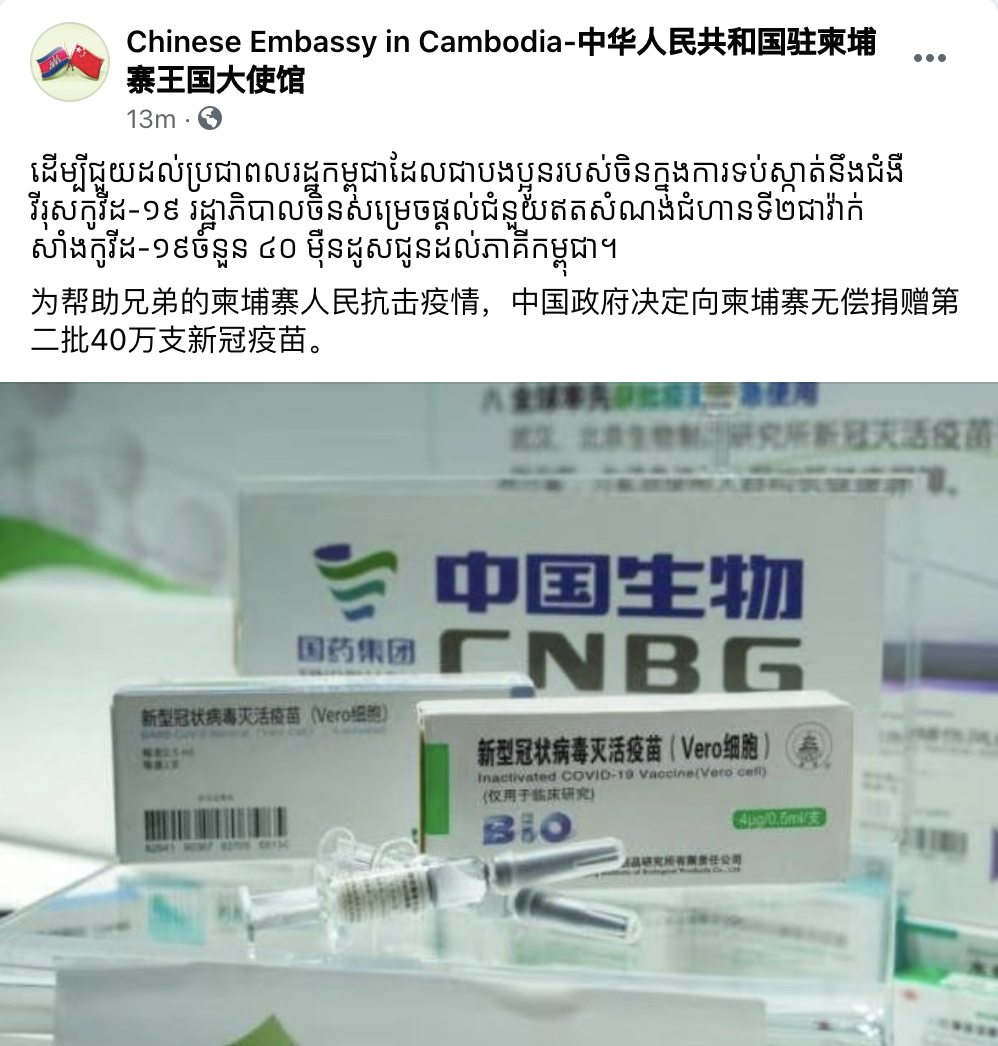ស្ថានទូតចិនប្រចាំប្រទេសកម្ពុជាបញ្ជាក់ថា ចិនសម្រេចផ្តល់ជំនួយវ៉ាក់សាំងកូវីដ១៩ ជំហានទី២ ចំនួន៤០ម៉ឺនដូសទៀតមកកម្ពុជា