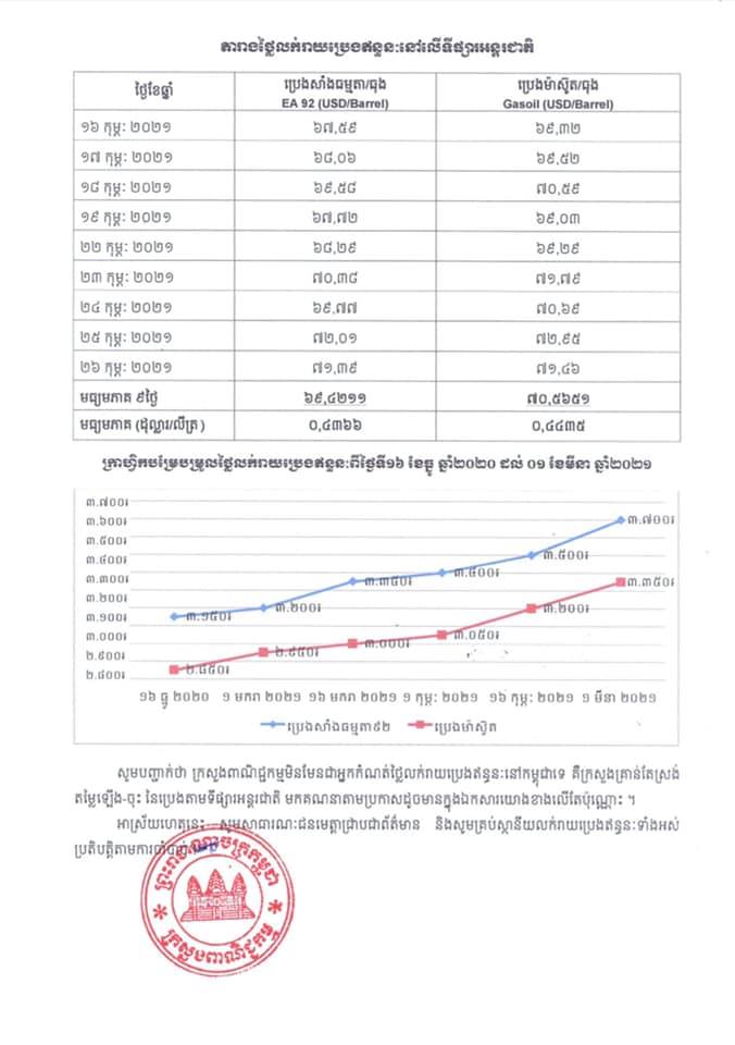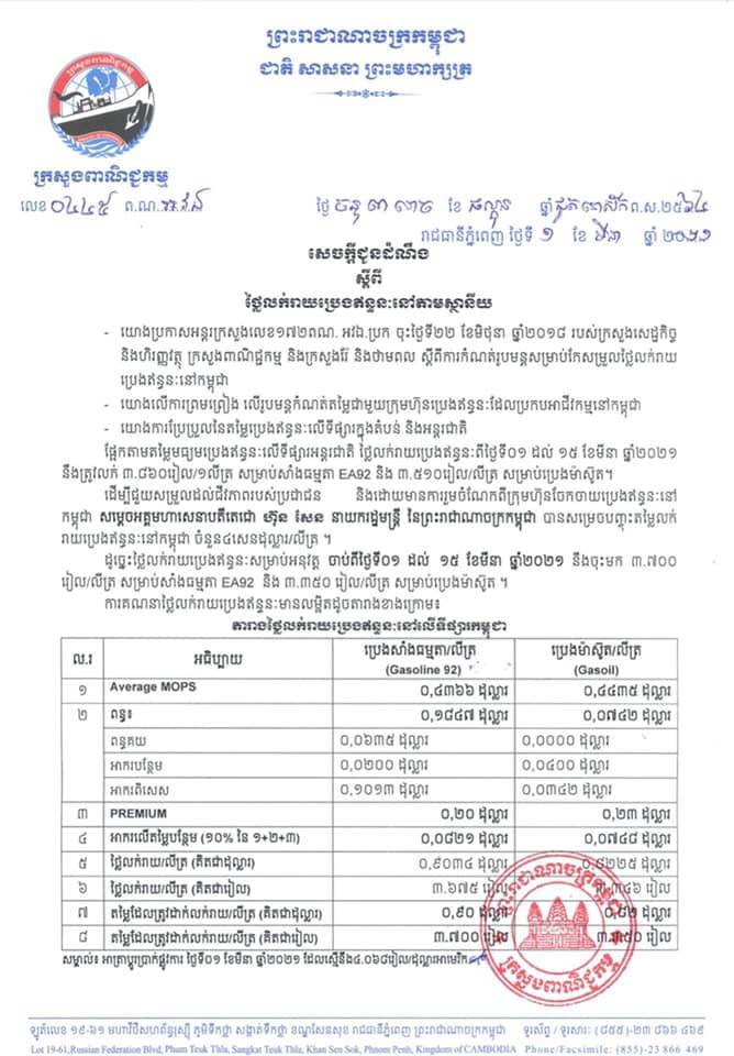 រាជធានីភ្នំពេញ៖ យោងតាមលិខិតរបស់ក្រសួងពាណិជ្ជកម្ម ចុះផ្សាយថ្ងៃទី០១ ខែមីនា ឆ្នាំ២០២១ ស្តីអំពីតម្លៃលក់រាយប្រេងឥន្ធនៈនៅតាមស្ថានីយទាំងអស់ក្នុងព្រះរាជាណាចក្រកម្ពុជាសម្រាប់អនុវត្តទៅតាមតម្លៃមធ្យមប្រេងឥន្ធនៈលើទីផ្សារអន្តរជាតិ ចាប់ពីថ្ងៃទី០១ ដល់ថ្ងៃទី១៥ ខែមីនា ឆ្នាំ២០២១ បានឲ្យដឹងថា តម្លៃប្រេងសាំងធម្មតាមានតម្លៃ ៣,៧០០រៀលក្នុងមួយលីត្រ ចំណែកឯប្រេងសាំងម៉ាស៊ូតមានតម្លៃ ៣,៣៥០រៀលក្នុងមួយលីត្រប៉ុណ្ណោះ។