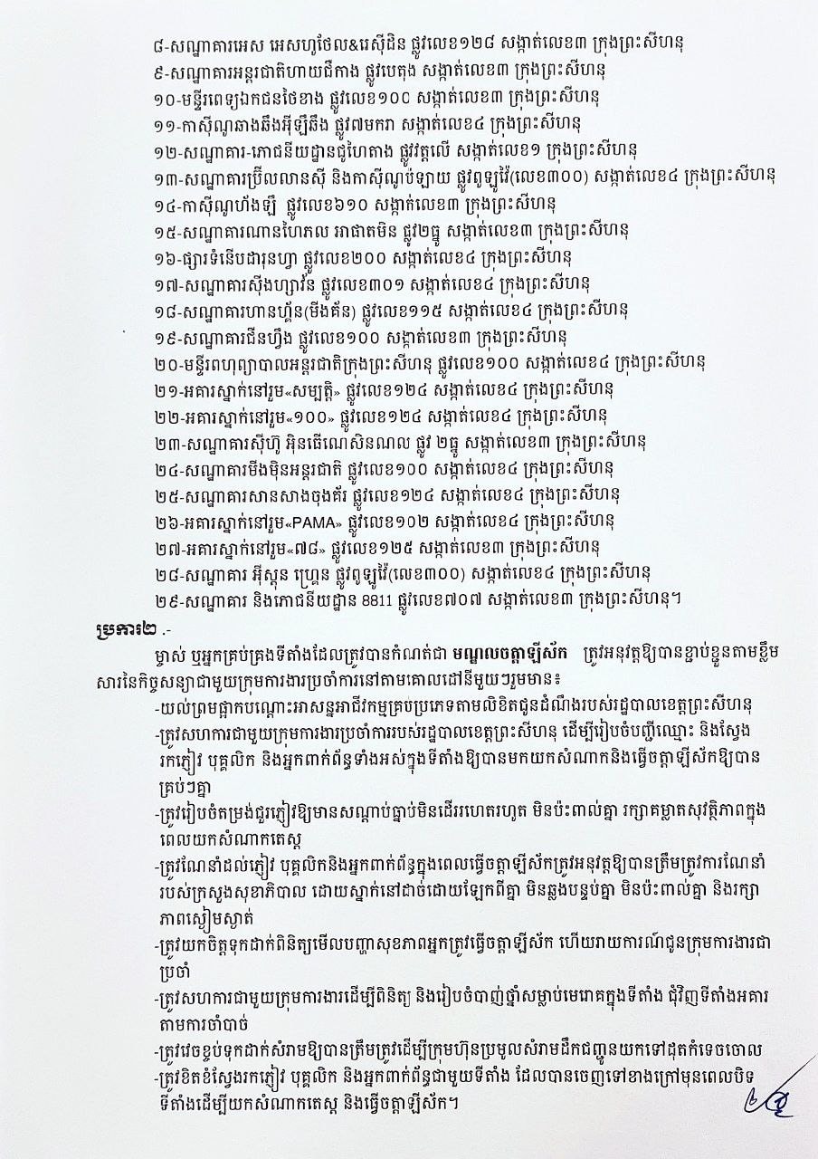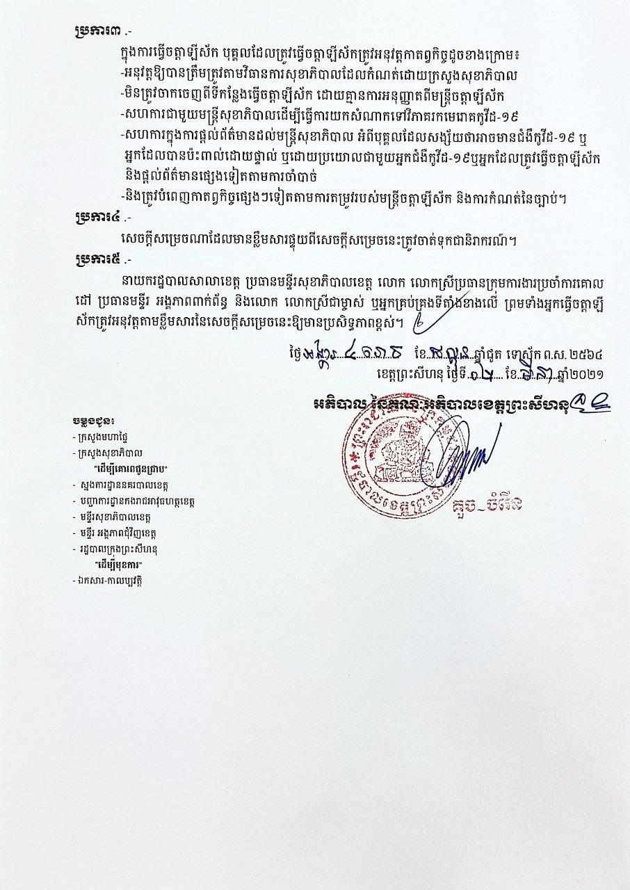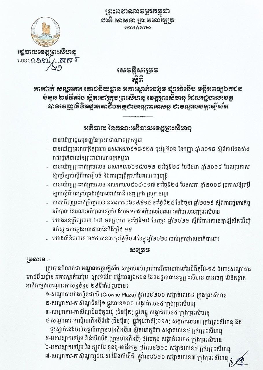 យោងតាមលិខិតពីរដ្ឋបាលខេត្តព្រះសីហនុ ចុះថ្ងៃទី០២ ខែមីនា ឆ្នាំ២០២១ បានឲ្យដឹងថា រដ្ឋបាលខេត្តបានសម្រេចដាក់ សណ្ឋាគារ ភោជនីយដ្ឋាន អគារស្នាក់នៅរួម ផ្សារទំនើប មន្ទីរពេទ្យឯកជន ចំនួន២៩ទីតាំងនៅក្រុងព្រះសីហនុ ខេត្តព្រះសីហនុ ដែលរដ្ឋបាលខេត្តបានចេញលិខិតផ្អាកអាជីវកម្មជាបណ្តោះអាសន្ន​ ត្រូវបានកំណត់ជា មណ្ឌលចត្តាឡីស័ក។ ទីតាំង២៩កន្លែង ដែលត្រូវបានផ្អាកអាជីវកម្មបណ្តោះអាសន្ន ហើយកំណត់ជា មណ្ឌលចត្តាឡីស័កនោះមានបញ្ជាក់នៅក្នុងលិខិតខាងក្រោម៖