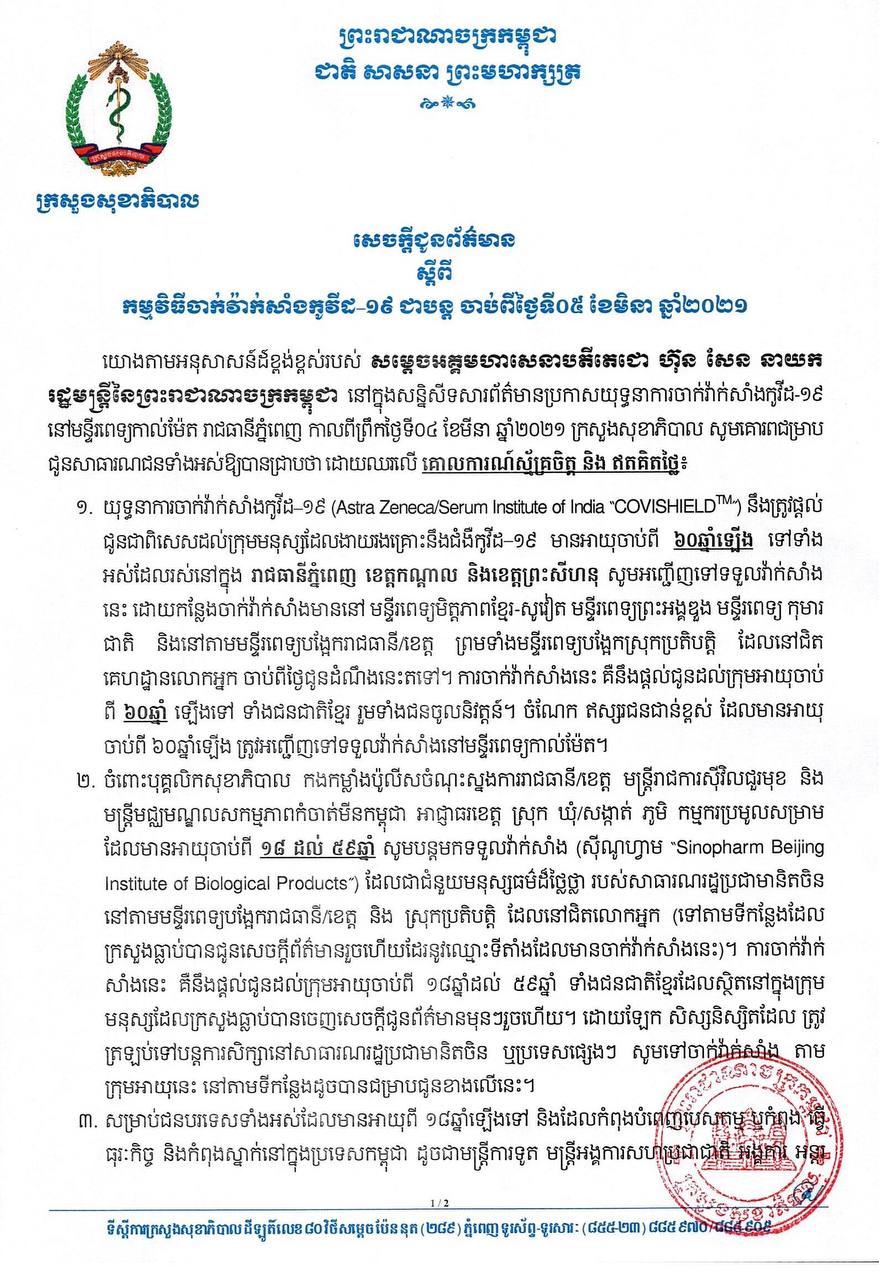 នាព្រឹកថ្ងៃទី០៥ ខែមីនា ឆ្នាំ២០២១នេះ ក្រសួងសុខាភិបាលបានធ្វើការប្រកាសអំពីយុទ្ធនាការចាក់វ៉ាក់សាំងកូវីដ១៩ នឹងត្រូវផ្តល់ជូនជាពិសេសដល់ក្រុមមនុស្សដែលងាយរងគ្រោះនឹងជំងឺកូវីដ១៩ មានអាយុចាប់ពី៦០ឆ្នាំឡើងទៅទាំងអស់ដែលរស់នៅ រាជធានីភ្នំពេញ ខេត្តកណ្តាល និងខេត្តព្រះសីហនុ។