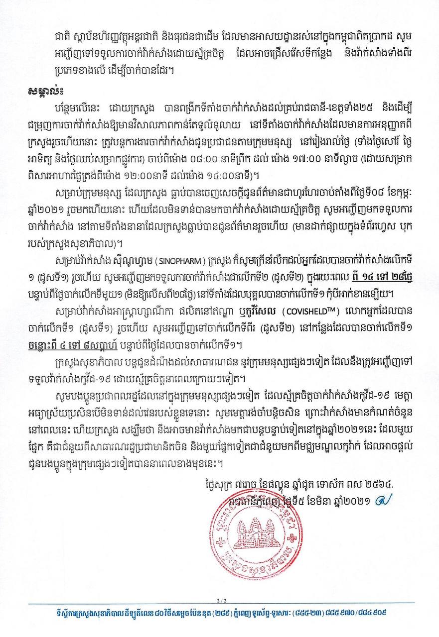 ក្រសួងសុខាភិបាល ប្រកាសជាផ្លូវការកម្មវិធីចាក់វ៉ាក់សាំងកូវីដ១៩ សម្រាប់ពលរដ្ឋអាយុចាប់ពី ៦០ឆ្នាំឡើង នៅភ្នំពេញ ខេត្តកណ្ដាល និងព្រះសីហនុ