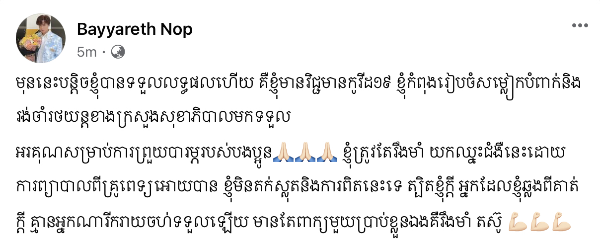 “មុននេះបន្តិចខ្ញុំបានទទួលលទ្ធផលហើយ គឺខ្ញុំមានវិជ្ជមានកូវីដ១៩ ខ្ញុំកំពុងរៀបចំសម្លៀកបំពាក់និងរង់ចាំរថយន្តខាងក្រសួងសុខាភិបាលមកទទួល