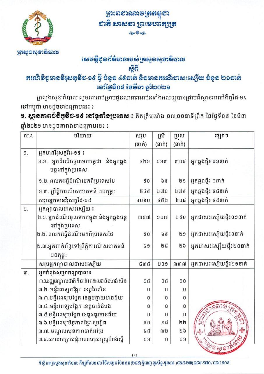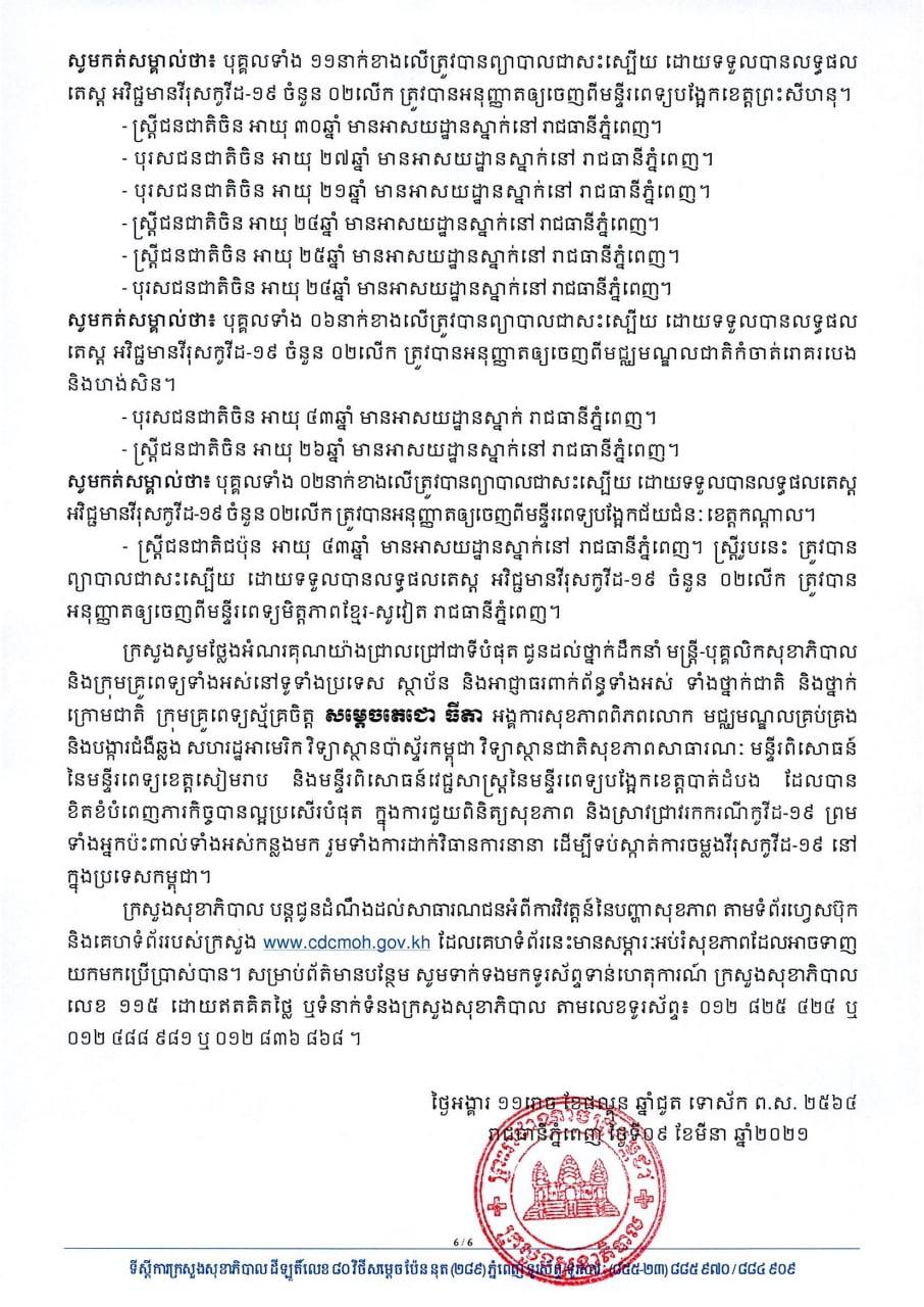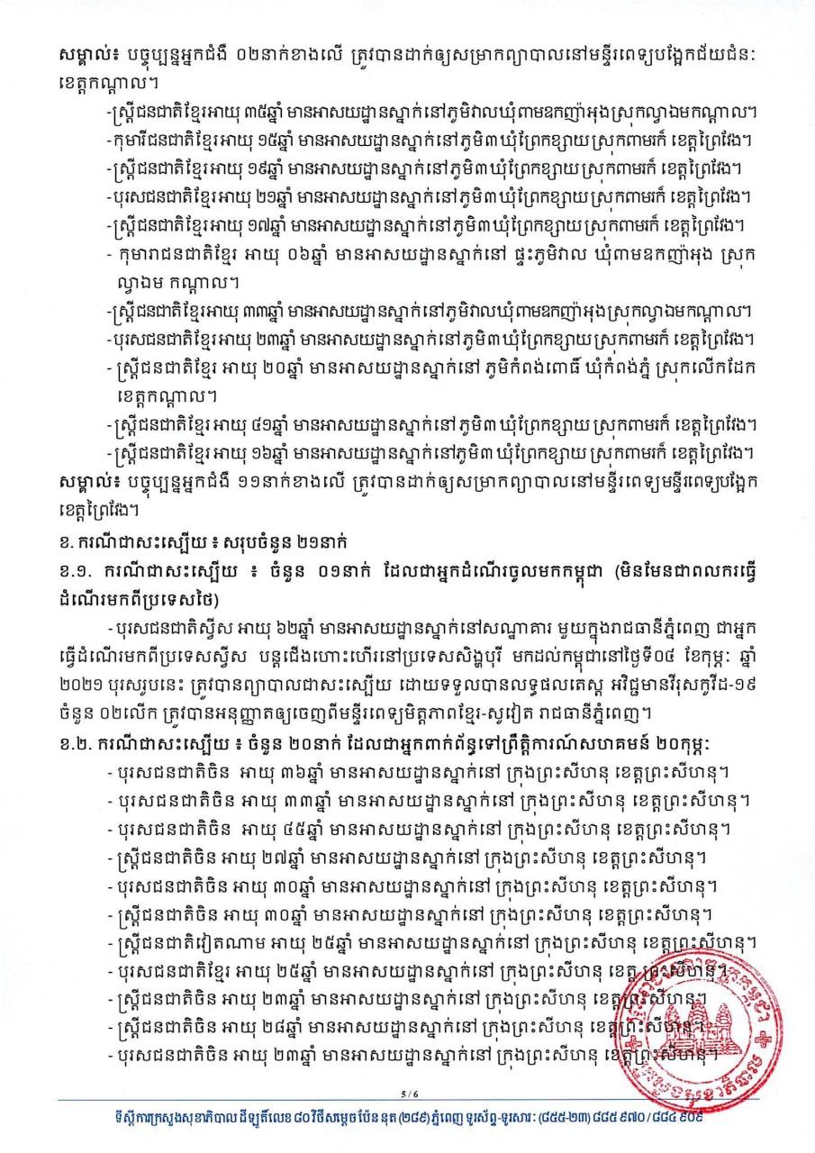 យោងតាមសេចក្តីប្រកាសរបស់ក្រសួងសុខាភិបាល បានបញ្ជាក់ថា អ្នកវិជ្ជមានទាំង៤៩នាក់នោះ គឺមាន០១នាក់ជាអ្នកដំណើរចូលមកកម្ពុជា និង៤៨នាក់ទៀត ជាអ្នកពាក់ព័ន្ធព្រឹត្តិការណ៍ សហគមន៍២០កុម្ភៈ ចំណែកឯអ្នកជាសះស្បើយទាំង២១នាក់មាន០១នាក់ជាអ្នកដំណើរចូលមកកម្ពុជា និង២០នាក់ទៀត ជាអ្នកពាក់ព័ន្ធព្រឹត្តិការណ៍ សហគមន៍២០កុម្ភៈ ។ សូមអានសេចក្តីជូនព័ត៌មាននៅខាងក្រោម៖