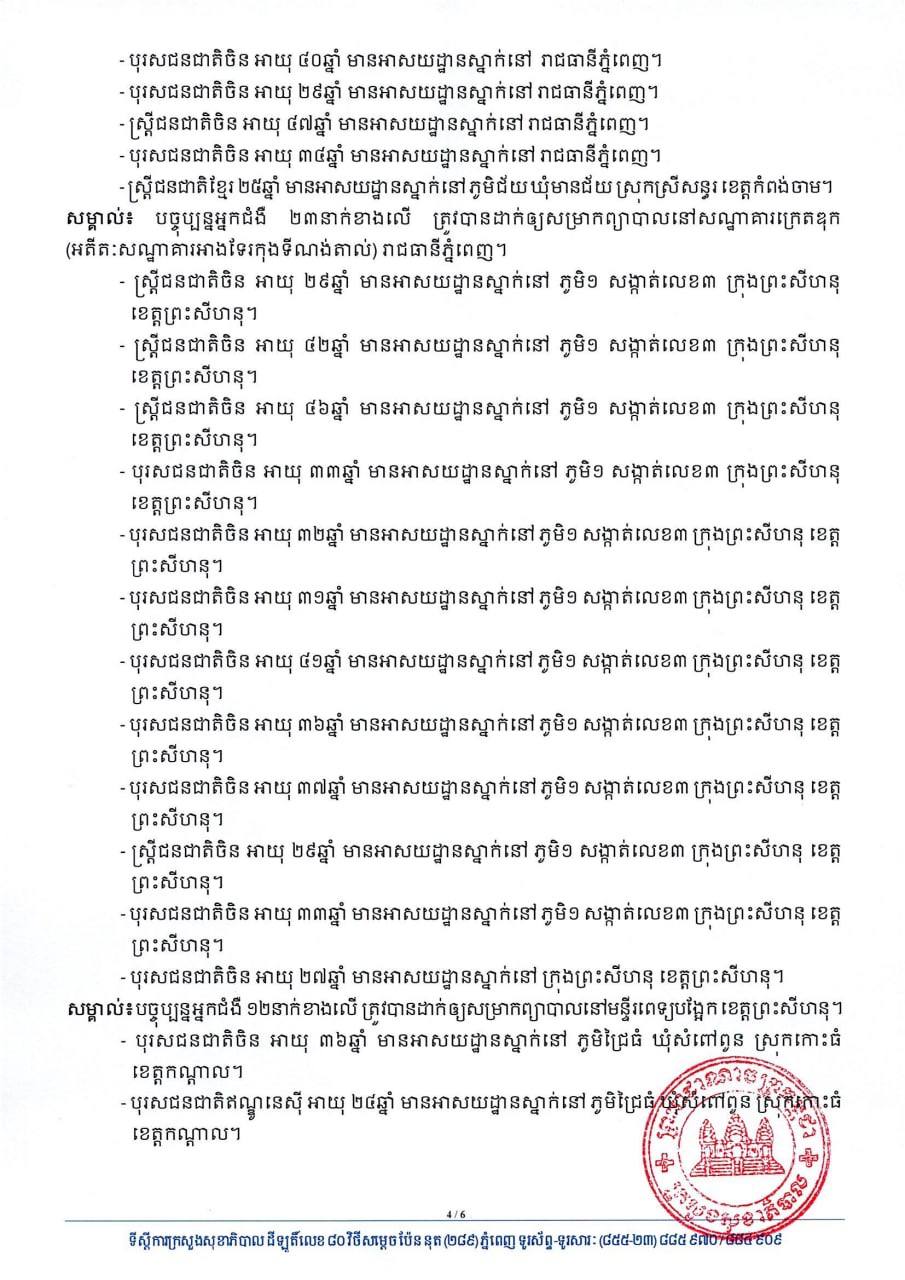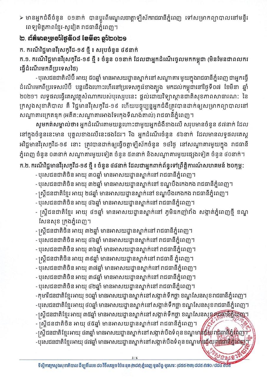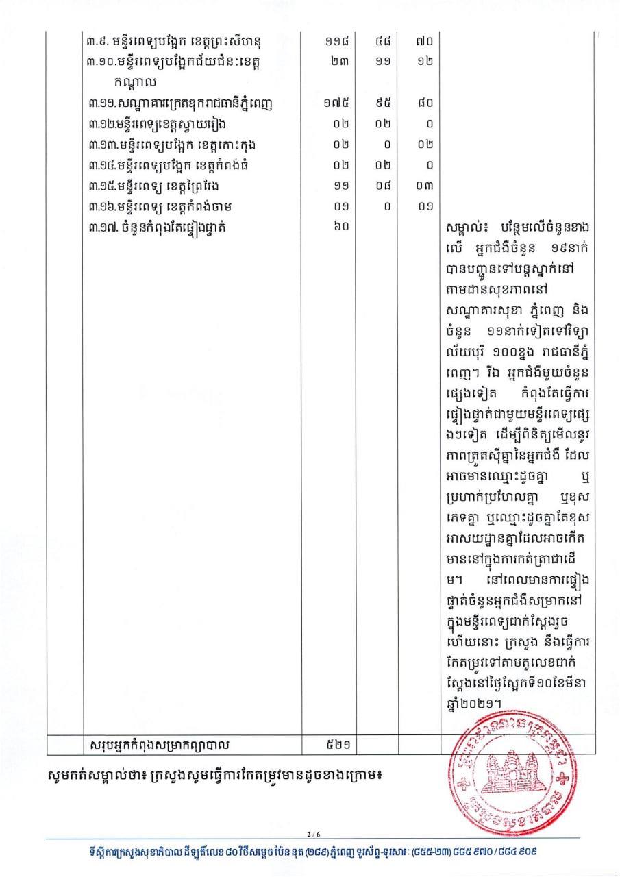 យោងតាមសេចក្តីប្រកាសរបស់ក្រសួងសុខាភិបាល បានបញ្ជាក់ថា អ្នកវិជ្ជមានទាំង៤៩នាក់នោះ គឺមាន០១នាក់ជាអ្នកដំណើរចូលមកកម្ពុជា និង៤៨នាក់ទៀត ជាអ្នកពាក់ព័ន្ធព្រឹត្តិការណ៍ សហគមន៍២០កុម្ភៈ ចំណែកឯអ្នកជាសះស្បើយទាំង២១នាក់មាន០១នាក់ជាអ្នកដំណើរចូលមកកម្ពុជា និង២០នាក់ទៀត ជាអ្នកពាក់ព័ន្ធព្រឹត្តិការណ៍ សហគមន៍២០កុម្ភៈ ។ សូមអានសេចក្តីជូនព័ត៌មាននៅខាងក្រោម៖