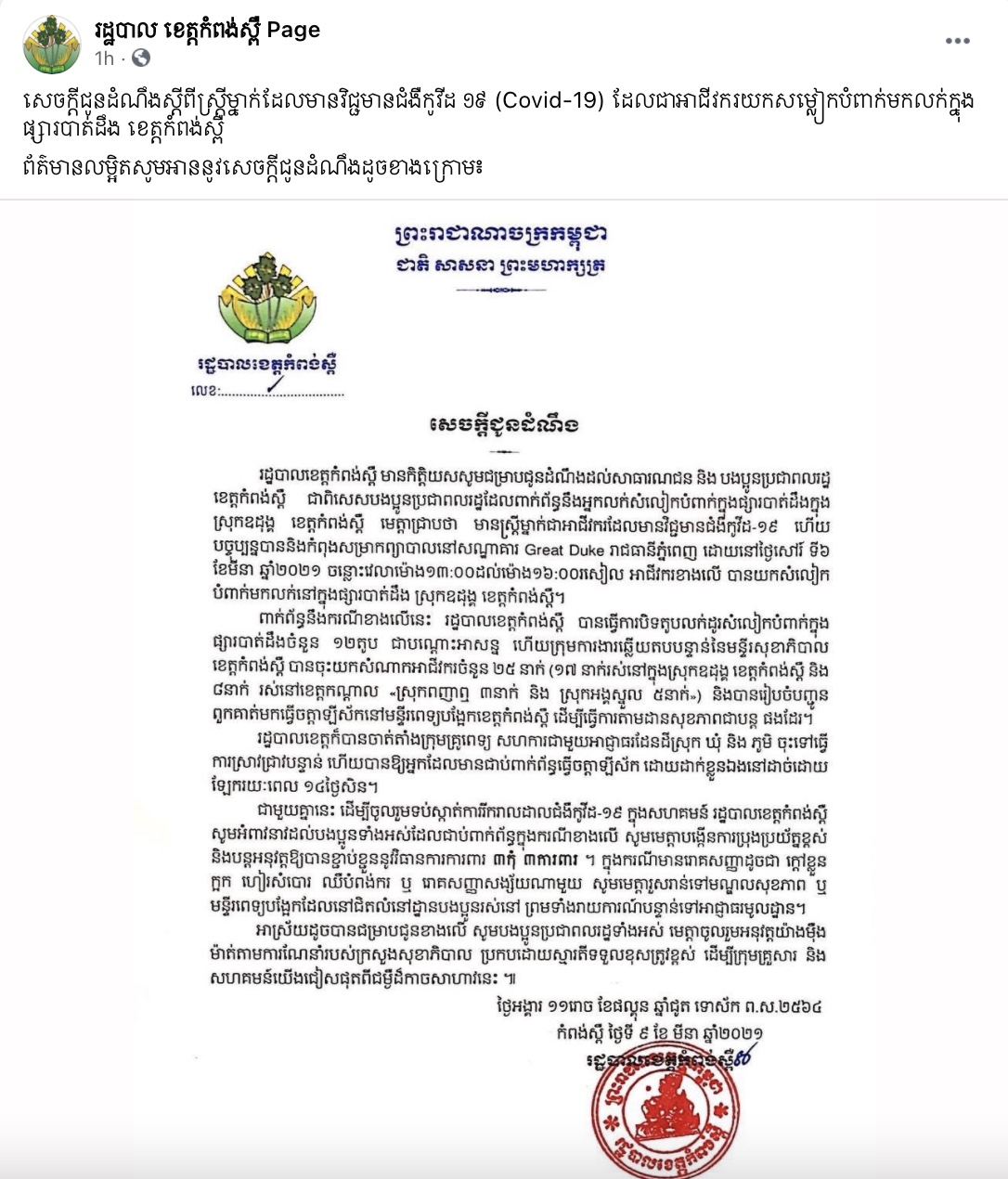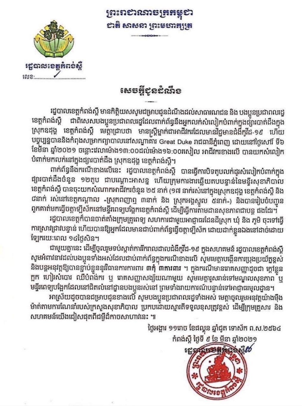 សេចក្តីជូនដំណឹងមួយរបស់រដ្ឋបាលខេត្តកំពង់ស្ពឺ ស្តីពីស្ត្រីអាជីវករម្នាក់ បានយកសំលៀកបំពាក់ទៅលក់នៅផ្សារបាត់ដឹង ក្នុងស្រុកឧដុង្គ ខេត្តកំពង់ស្ពឺ បានរកឃើញវិជ្ជមានកូវីដ-១៩ ដោយពេលនេះគាត់ត្រូវបានដាក់អោយសម្រាកព្យាបាលនៅសណ្ឋាគារ Great Duke រាជធានីភ្នំពេញ។