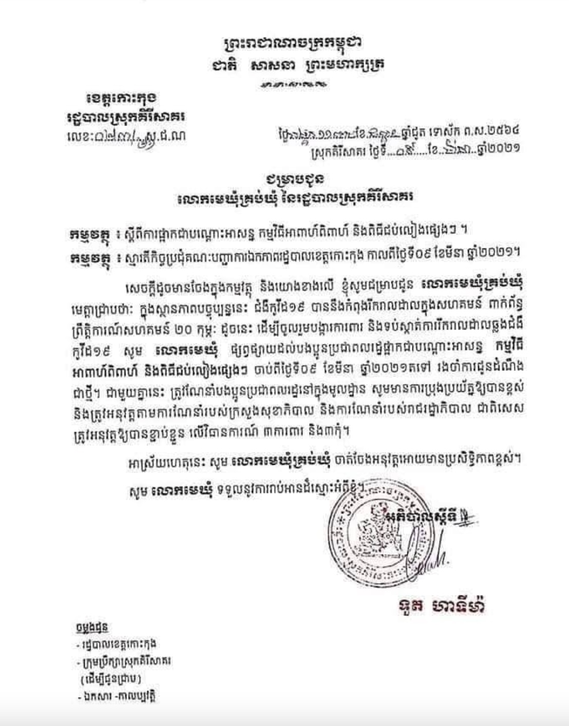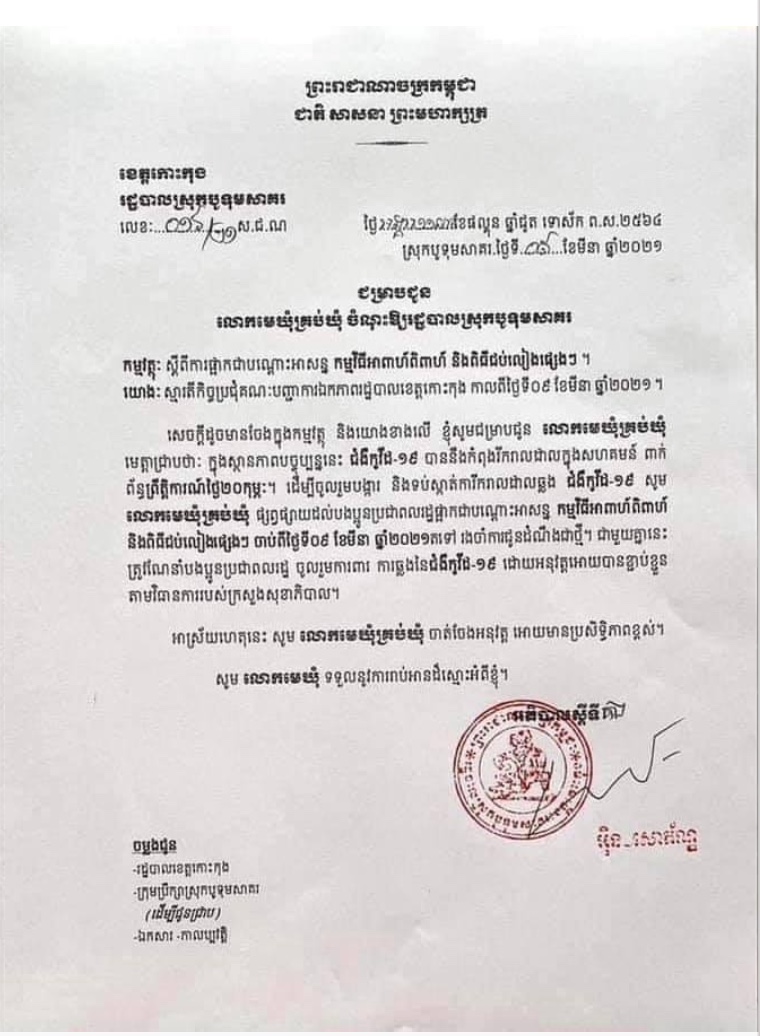 បន្ទាន់ ! ខេត្តកោះកុង សម្រេចអោយផ្អាកពិធីមង្គលការ និងពិធីជប់លៀងនានា នៅស្រុកគិរីសាគរ និងស្រុកបូទុមសាគរ