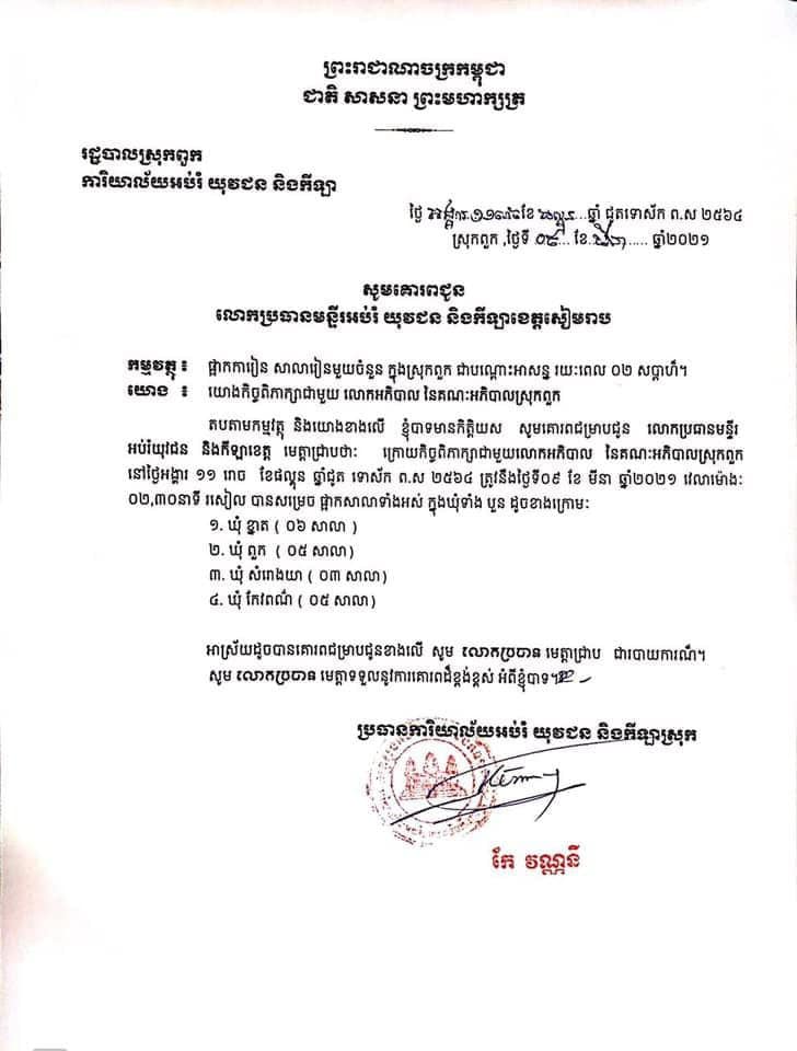 រដ្ឋបាលស្រុកពួក ខេត្តសៀមរាប សម្រេចផ្អាកសាលារៀនក្នុងស្រុក ចំនួន១៩កន្លែង រយ:ពេល២សប្តាហ៍