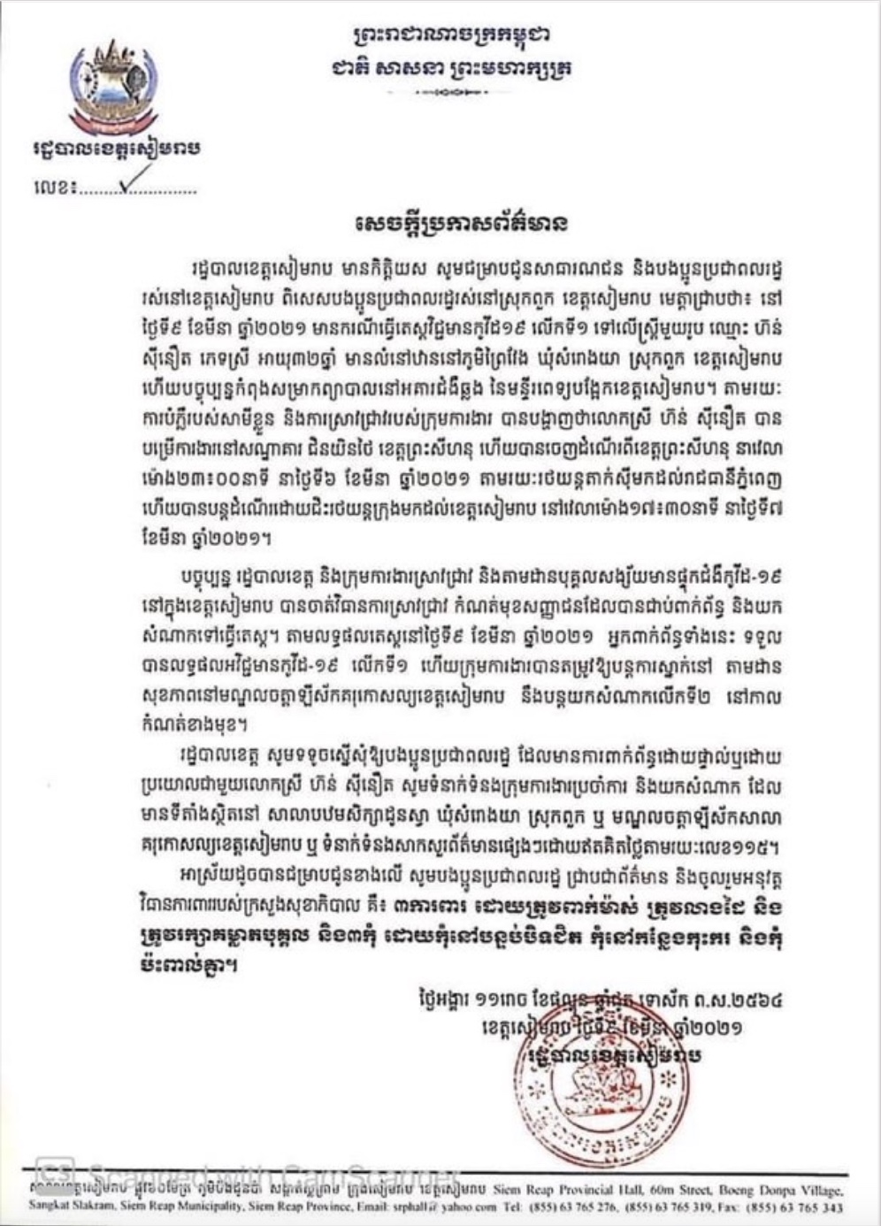 នៅយប់ថ្ងៃទី០៩ ខែមីនា ឆ្នាំ២០២១នេះដែរ រដ្ឋបាលខេត្តសៀមរាបបានចេញសេចក្តីប្រកាសព័ត៌មានមួយស្តីពីការរកឃើញវិជ្ជមានកូវីដ-១៩ លើកទី១ ទៅលើស្ត្រីមួយរូប ឈ្មោះ ហ៊ន់ ស៊ីនឿត ភេទស្រី អាយុ៣២ឆ្នាំ ដែលជាអ្នកធ្វើការនៅសណ្ឋាគារ ជិនយិនថៃ ខេត្តព្រះសីហនុ ហើយធ្វើដំណើរមកកាន់លំនៅឋាន នៅភូមិព្រៃវែង ឃុំសំរោងយា ស្រុកពួក ខេត្តសៀមរាប។