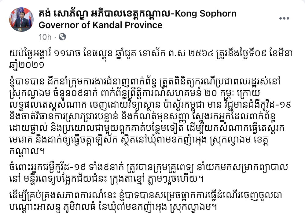 យោងតាមការបញ្ជាក់នៅលើទំព័រហ្វេសប៊ុក ឯកឧត្តម គង់ សោភ័ណ្ឌ បានឲ្យដឹងថា នៅយប់ថ្ងៃអង្គារ៍ ១១រោច ខែផល្គុន ឆ្នាំជូត ទោស័ក ព.ស ២៥៦៤ ត្រូវនឹងថ្ងៃទី០៩ ខែមីនា ឆាំ្ន២០២១ ឯកឧត្តម គង់ សោភ័ណ្ឌ អភិបាល នៃគណៈអភិបាលខេត្តកណ្ដាល បានដឹកនាំក្រុមការងារជំនាញពាក់ព័ន្ធ ត្រួតពិនិត្យករណីប្រជាពលរដ្ឋរស់នៅស្រុកល្វាឯម ចំនួន០៩នាក់ ពាក់ព័ន្ធព្រឹត្តិការណ៍សហគមន៍ ២០ កុម្ភៈ ក្រោយលទ្ធផលតេស្តសំណាក ចេញដោយវិទ្យាស្ថាន ប៉ាស្ទ័រកម្ពុជា មាន វិជ្ជមានជំងឺកូវីដ-១៩ និងចាត់វិធានការស្រាវជ្រាវបន្ទាន់ និងកំណត់មុខសញ្ញា ស្វែងរកអ្នកដែលពាក់ព័ន្ធដោយផ្ទាល់ និងប្រយោលជាមួយពួកគាត់បន្ថែមទៀត ដើម្បីយកសំណាកធ្វើតេស្តរកមេរោគ និងដាក់ឲ្យធ្វើចត្តាឡីស័ក ស្ថិតនៅឃុំពាមឧកញ៉ាអុង ស្រុកល្វាឯម ខេត្តកណ្ដាល។